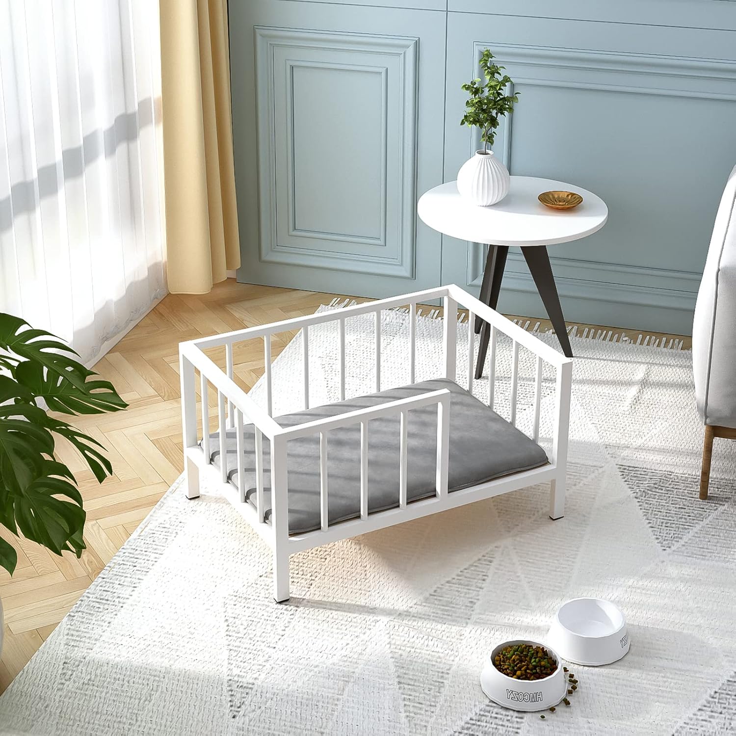 Dog Bed with Rails - Elevated Pet Metal Bed Frame with Solid Wood Board and Washable Soft Mat for Small Dog Indoor or Outdoor Use, 21.3" x 30 ", White