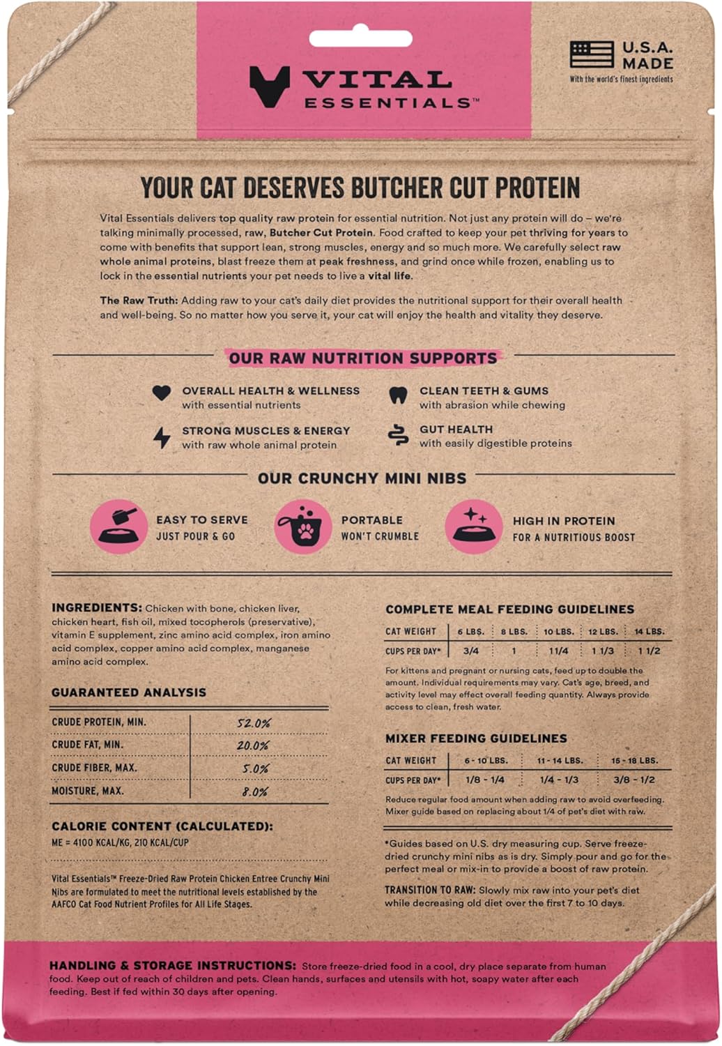 • CRUNCHY FREEZE-DRIED RAW CHICKEN CAT FOOD: Vital Essentials Crunchy Freeze Dried Cat Food packs more protein than industry standard into every bite to deliver the peak vitality your cat deserves, especially when compared to dehydrated cat food. This complete and balanced freeze-dried raw cat food is made with premium butcher cut chicken, responsibly sourced in the USA.
