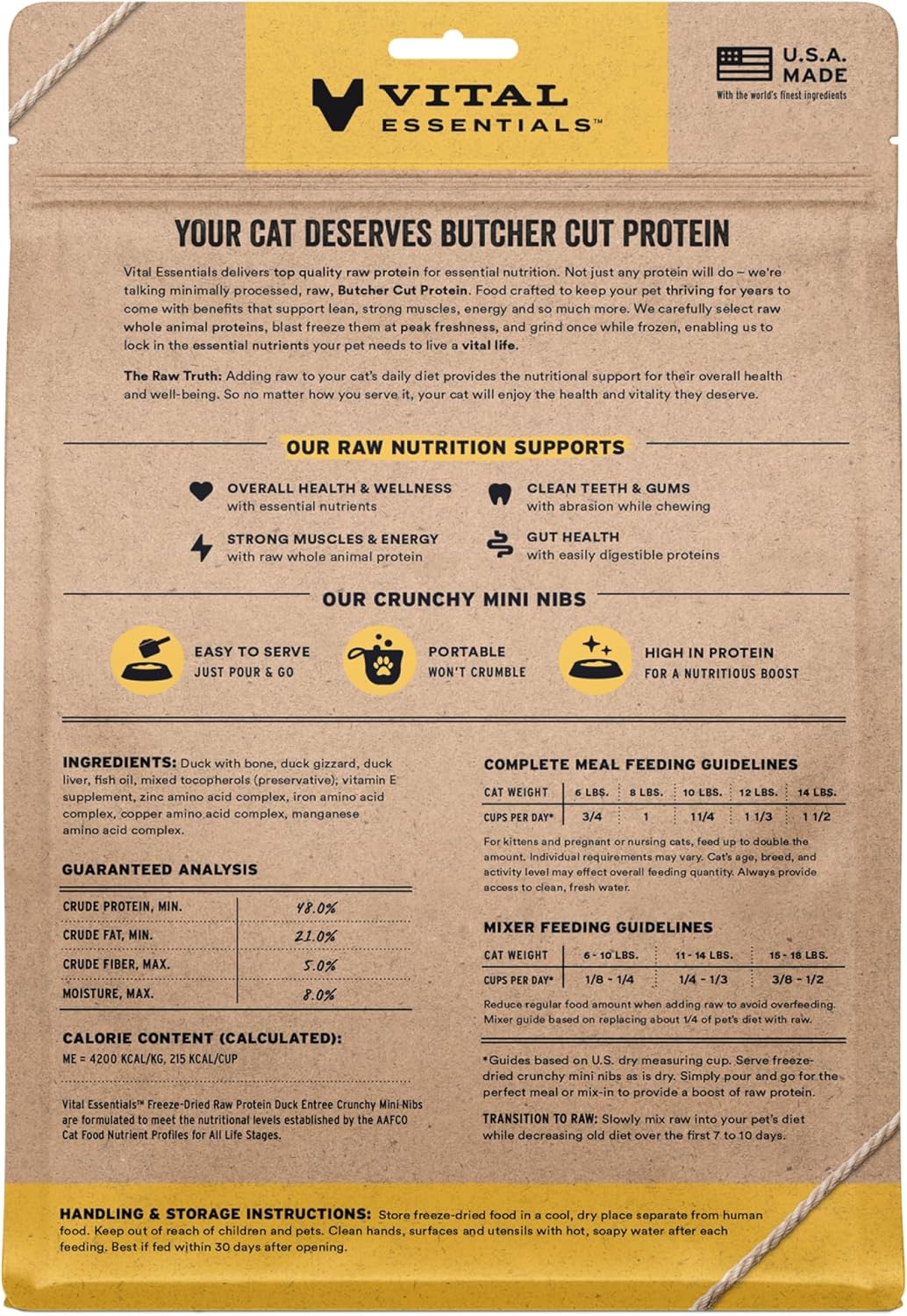 • CRUNCHY FREEZE-DRIED RAW DUCK CAT FOOD: Vital Essentials Crunchy Freeze Dried Cat Food packs more protein than industry standard into every bite to deliver the peak vitality your cat deserves, especially when compared to dehydrated cat food. This complete and balanced freeze-dried raw cat food is made with premium butcher cut duck, responsibly sourced in the EU.