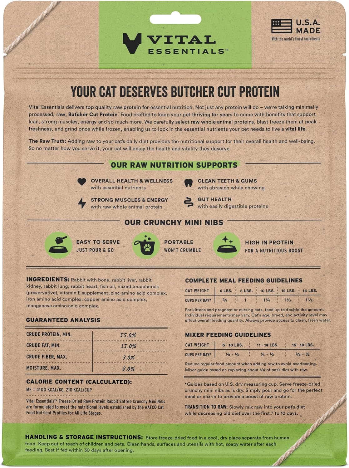 • CRUNCHY FREEZE-DRIED RAW RABBIT CAT FOOD: Vital Essentials Crunchy Freeze Dried Cat Food packs more protein than industry standard into every bite to deliver the peak vitality your cat deserves, especially when compared to dehydrated cat food. This complete and balanced freeze-dried raw cat food is made with premium butcher cut rabbit, responsibly sourced in the EU.