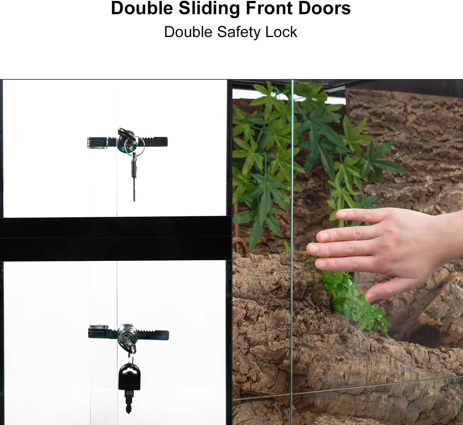- ใDouble Front Sliding DoorใAdopt new patent design to be top grade small animal and reptile terrarium. In order to manage the tall reptile tank more conveniently, this bearded dragon terrarium has two upper and lower sliding doors. It's easy to clean the tank or add decoration. Safety lock prevents unwanted opening from children or pets.