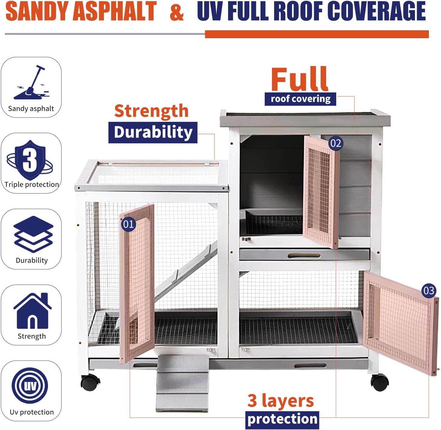 • Comfortable and safe rabbit hutch -- The rabbit hutch is made of environmentally friendly waterproof and non-toxic varnish, while the cedar wood construction is pet-friendly and weather-resistant, and the asphalt roof will effectively protect the small pets inside from wind/rain/snowy weather. Suitable for both indoor and outdoor environments.