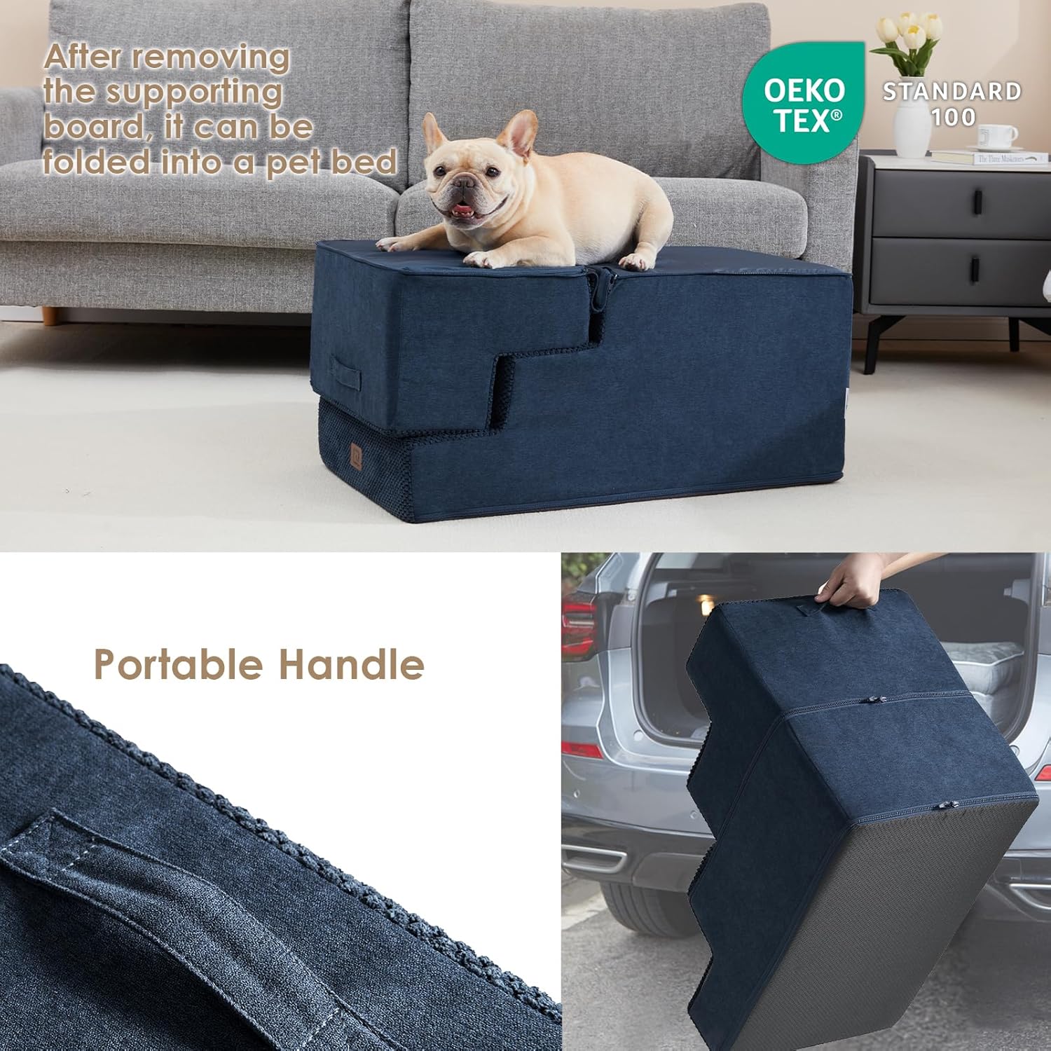 • STEADY & FOLDABE: With a 30D high density foam and eco-friendly support board, this dog stair offers enhanced stability. It can also be folded into a basic dog bed for your furry puppy to sleep.