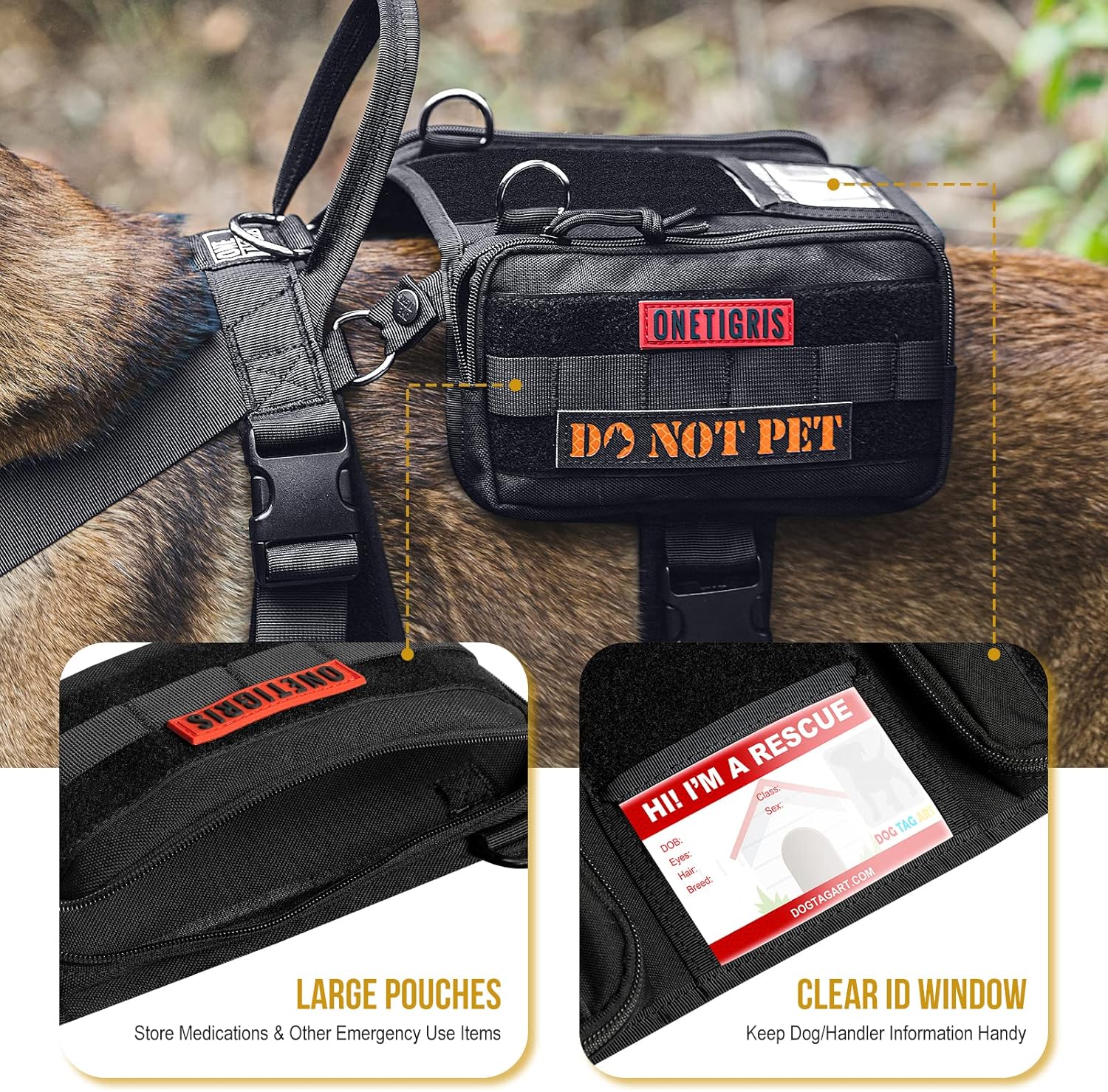 • Comes with an ergonomic strapped harness, saddled canine EDC pouches, with leash clips, MOLLE compatibility, patch panels, clear ID window, and service dog handle attachment D-rings.