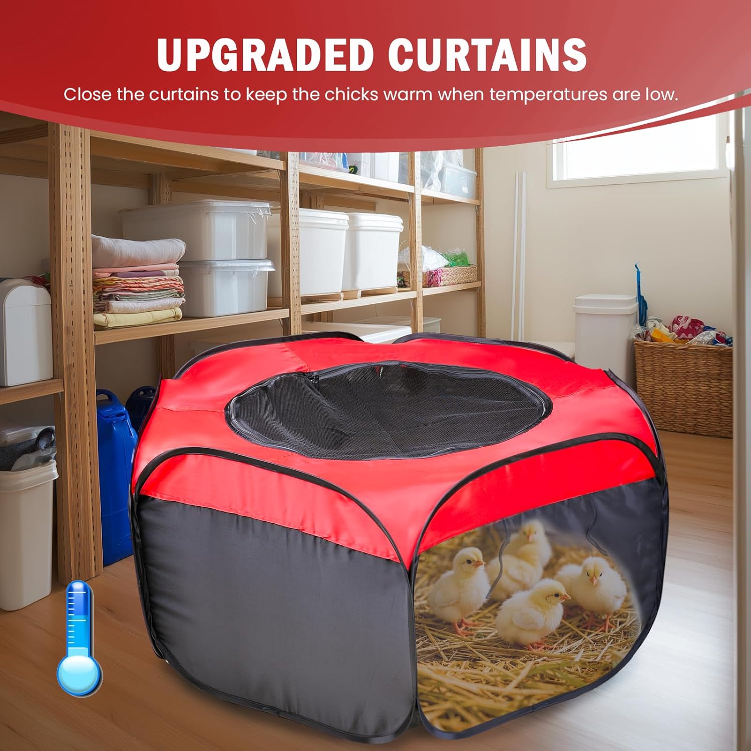 • INDOOR & OUTDOOR USE - Perfect for indoor or outdoor settings, this baby chick brooder features an advanced double-door design, three-sided mesh design, and escape-proof mesh. The warm curtains is perfect for outdoor, providing excellent cold protection. Indoors you can open the breathable mesh panels, which offer good ventilation to ensure a cool and comfortable environment. while also preventing the chicks from escaping. This playpen will keep your chicks safe, happy, and comfortable.