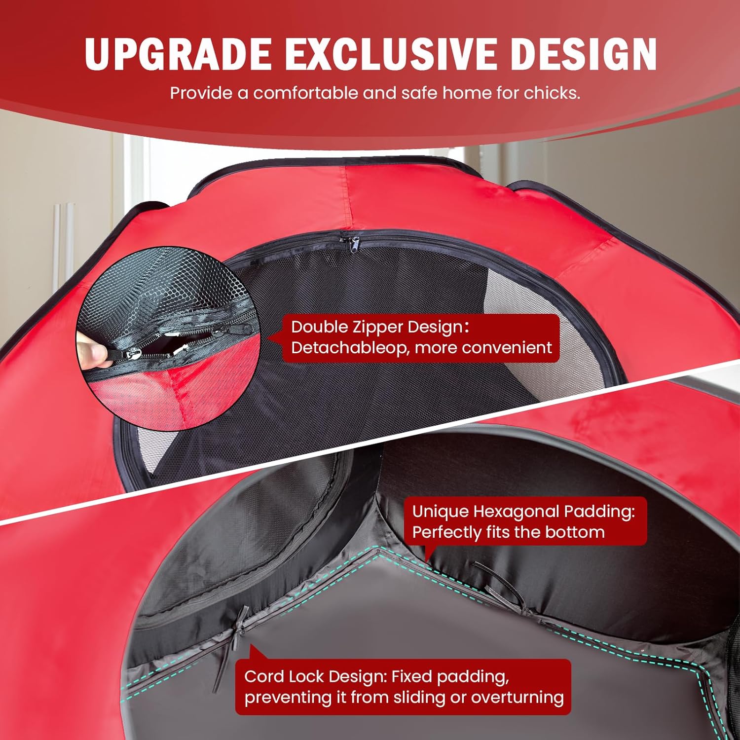 • EASY TO PUT UP & FOLD - Featuring a pop-up design and built-in frame, the chicken brooder box is easy to open and close. It includes 3 ground pegs for outdoor use and folds into a plate-sized storage bag.