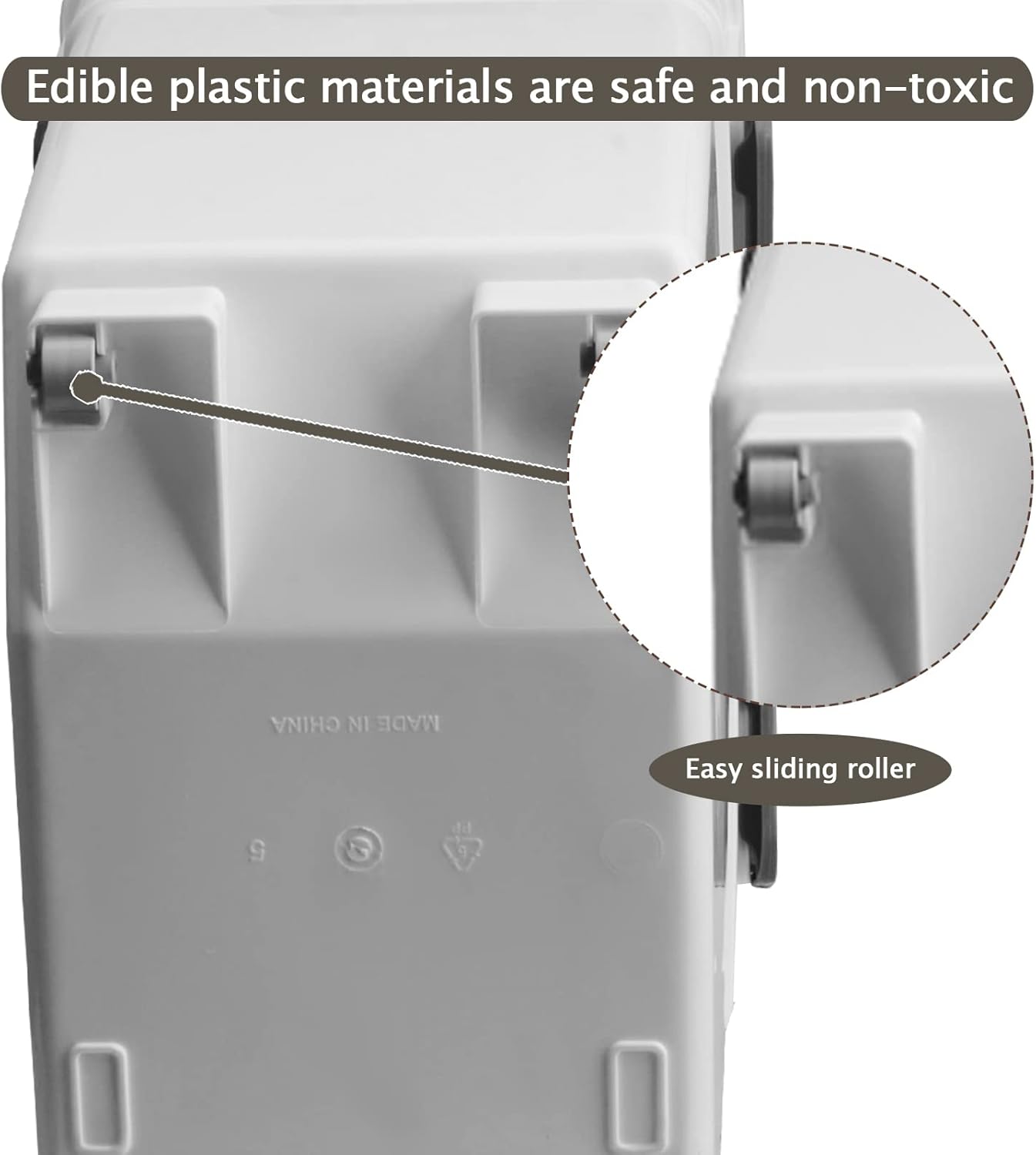 • 【Easy To Use】The front of the plastic dog food storage container has a groove and with a large inclined opening, which make it very easy to take out and fill. With transparent lids, the remaining amount of the barrel at a glance; There are 2 small wheels in the back, you only need to lift the front to pull out it easily.