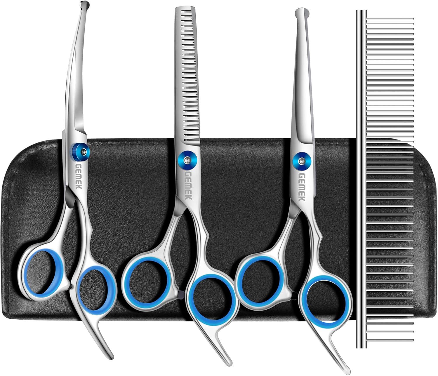 GEMEK Professional 5 in 1 Dog Grooming Scissors Set with Safety Round Tips, Sharp and Heavy-duty Pet Grooming Shears for Cats (Blue)