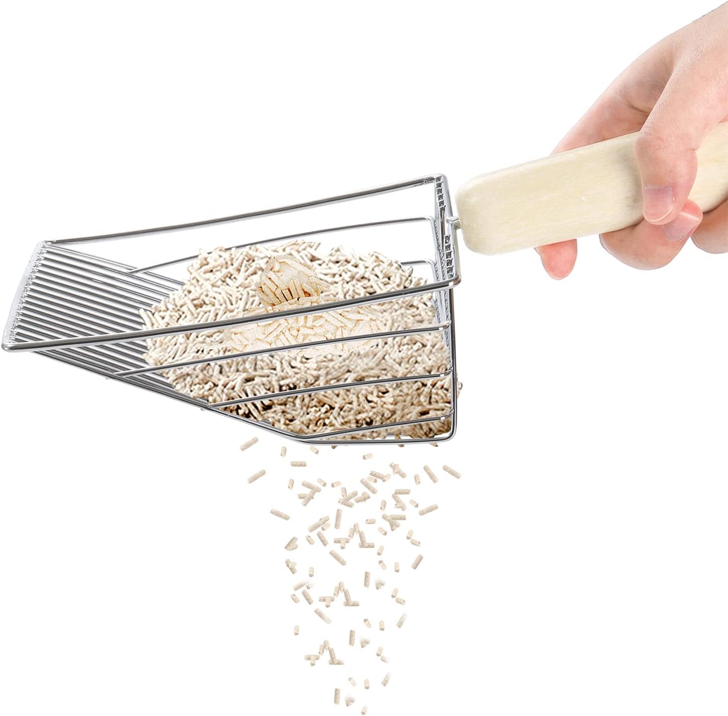 • DURABLE MATERIAL - Our kitty litter scooper is made of high-quality metal that are built to last. The metal construction ensures that it won't rust and can withstand all kinds of bumps. The base is made of selected ABS material, which is durable, wear-resistant, and not afraid of damage. And the solid wood handle adds a touch of warmth and comfort to the design.