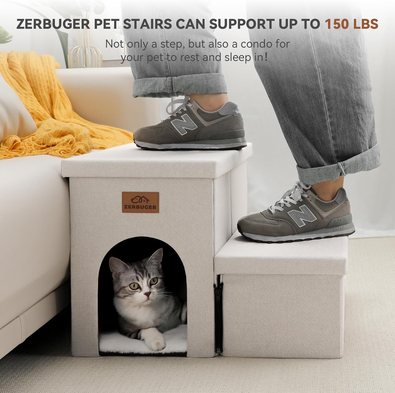 - 3-IN-1 DOG STAIRS AND CONDO: Zerbuger pet stairs not only provide a stable and cozy place for your pet to rest, but also serve as a convenient 24QT large storage area for your pet's clothes, toys, or any other supplies. Our pet steps are covered with removable lids, Every steps are designed as storage boxes.