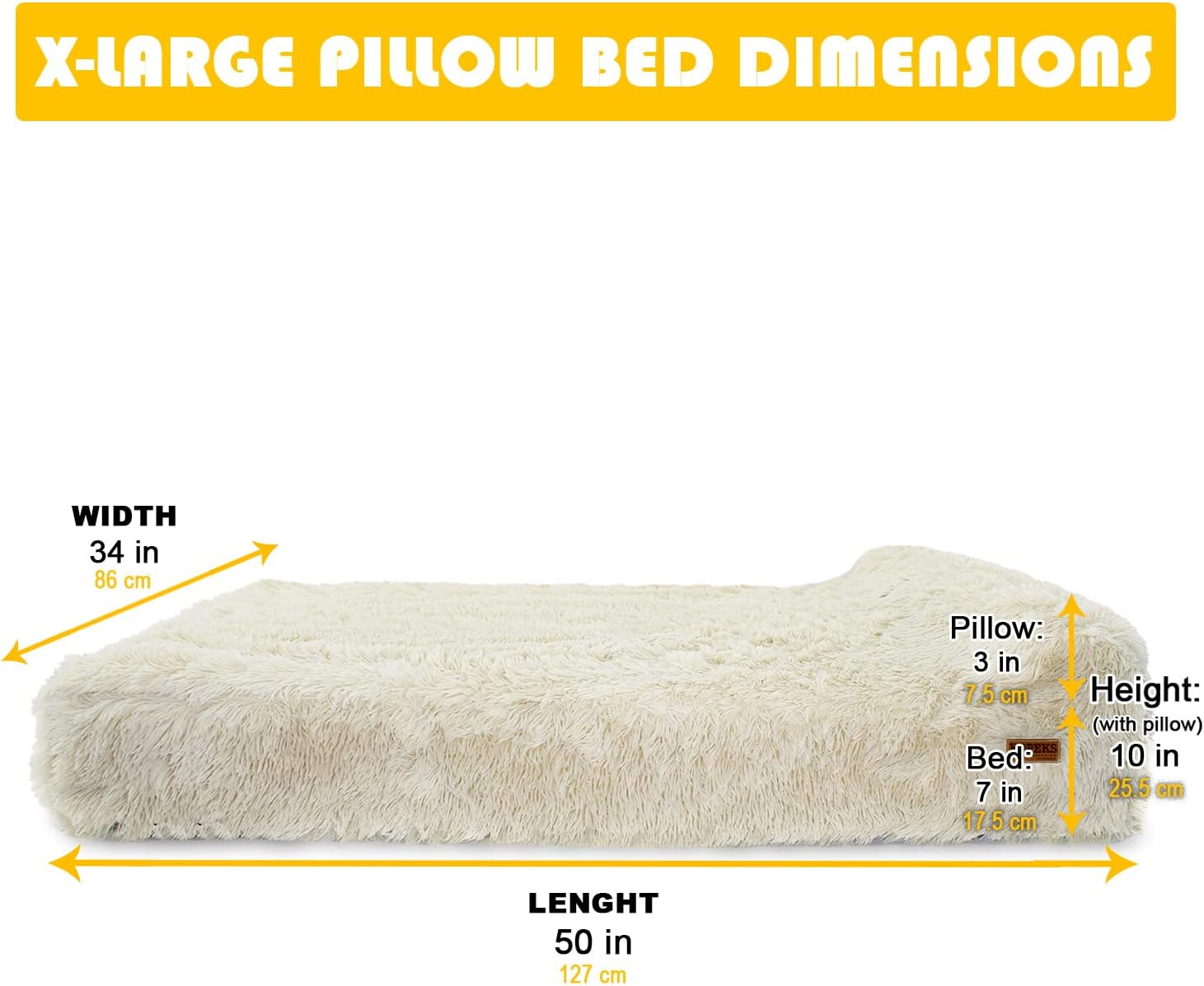 • Extra Large Orthopedic Dog Bed: This jumbo dog bed is a full 50" large and 34” wide, made of 7” thick memory foam that relieves pressure on joints and boasts a 3” thick headrest that supports the dog's head, for optimal comfort.