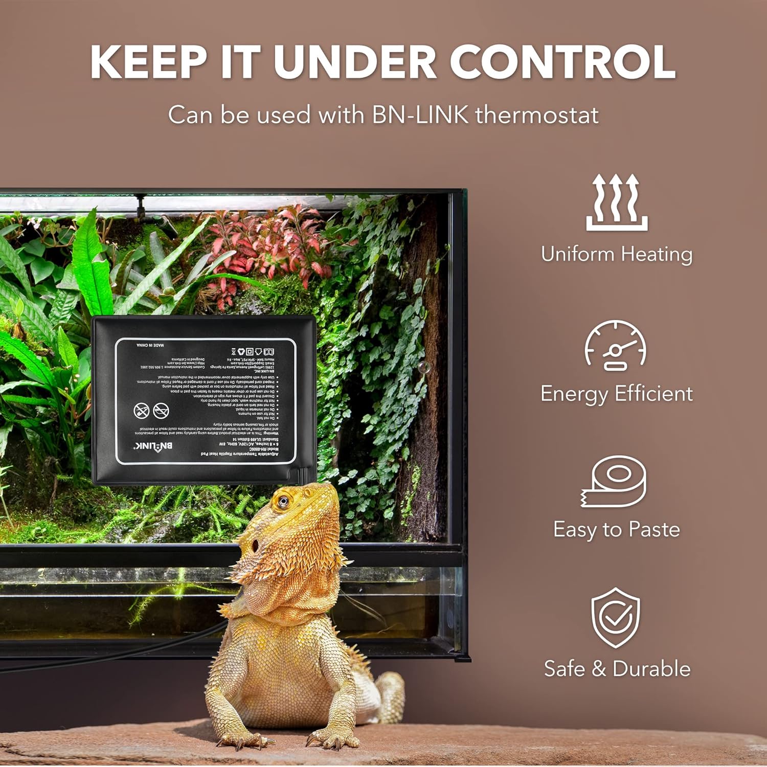 • ENERGY EFFICIENT AND SPACE-SAVING: The BN-LINK reptile heat mat is both compact and packs a punch. The heating wire and insulation allows the mat to reach the desired temperatures within minutes yet only uses 8 Watts to help you save on electricity costs.