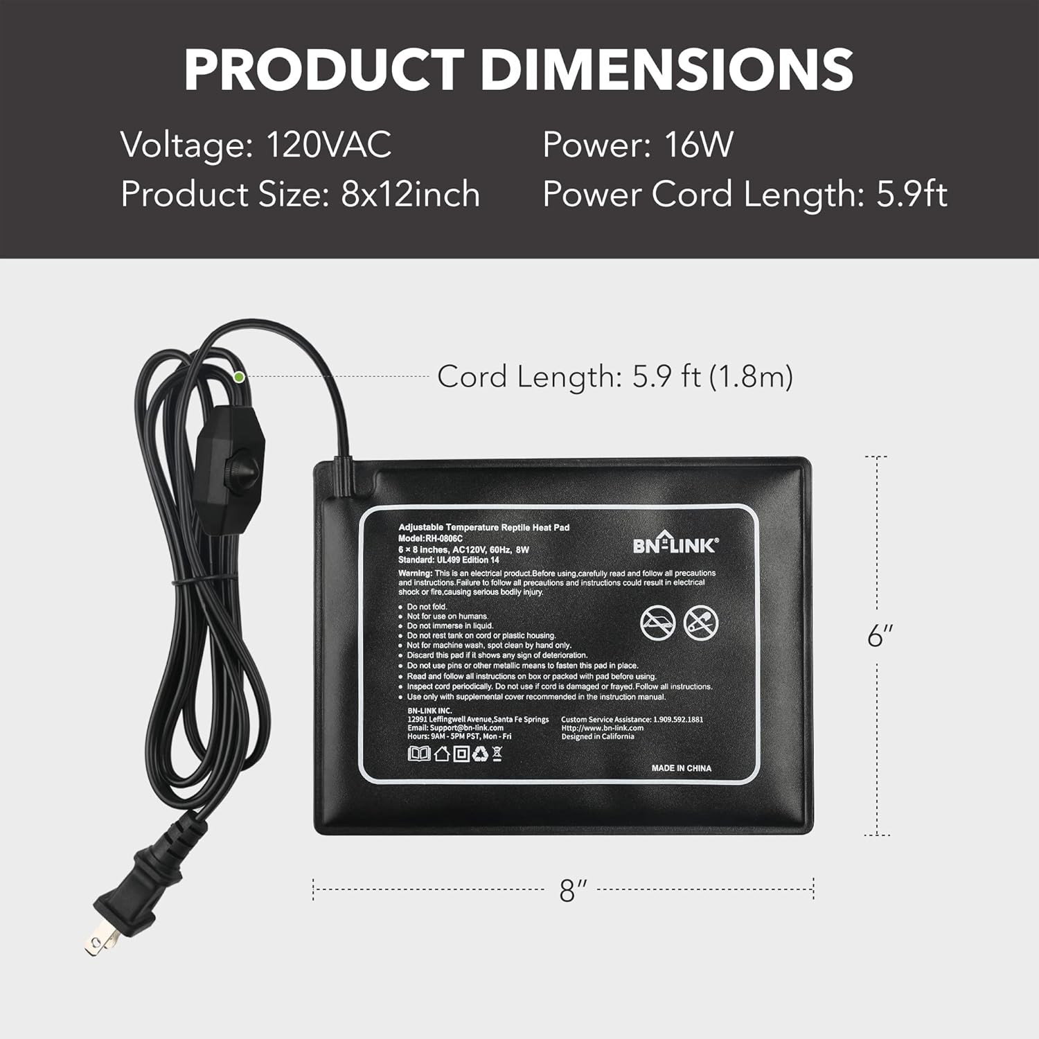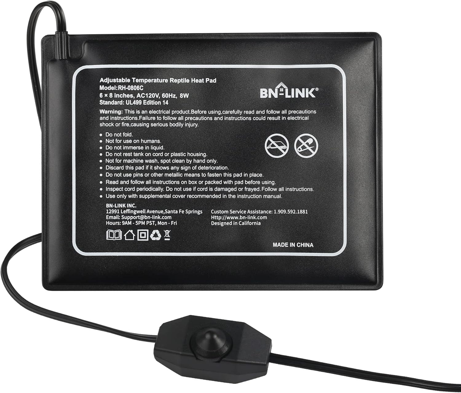 • MADE FOR REPTILES: Voltage: 120 volt, Power: 8 watt. The 6" x 8" with adjustable knob model is perfect for a 10 -20 gallon terrarium and it can easily put out steady heat between 104℉ and 122℉. Each unit comes with BN-LINK’s strong 15-month warranty.