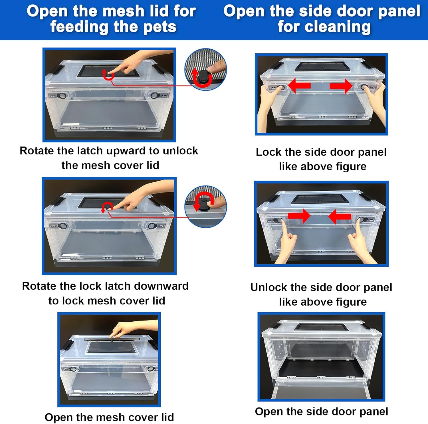 • 【Flexible opening and closing cover and side door】The top mesh lid can be opened and closed for better air flow and easy pet feeding;The Front panel can be opened and closed for easy cleaning of pet house