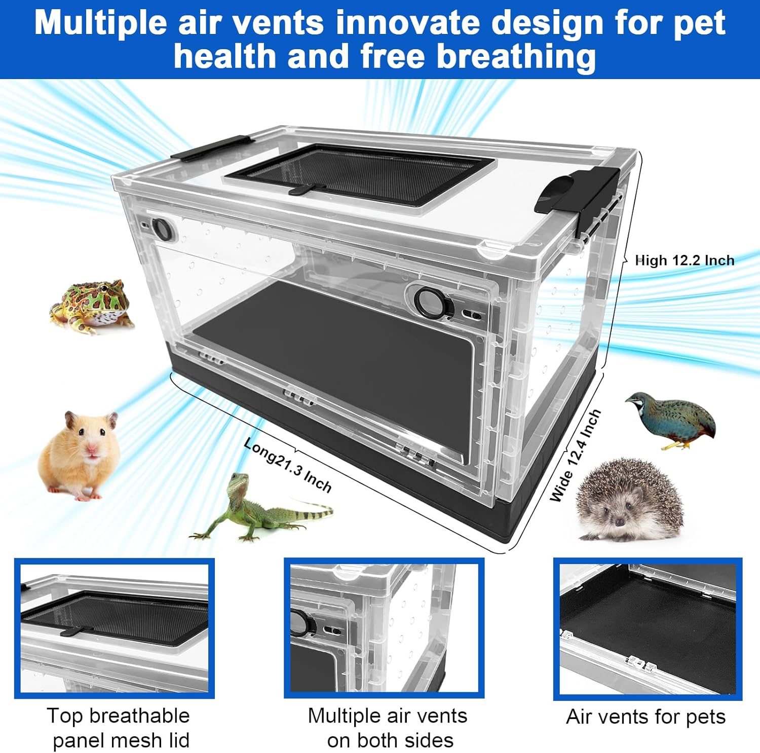• 【Innovate design for pet health and free breathing】Our reptile and small animal cage for breeding house has top breathable panel mesh lid,multiple air vents on both side and air vents on bottom for better air circulation and flow which let the pet in product have free breathing