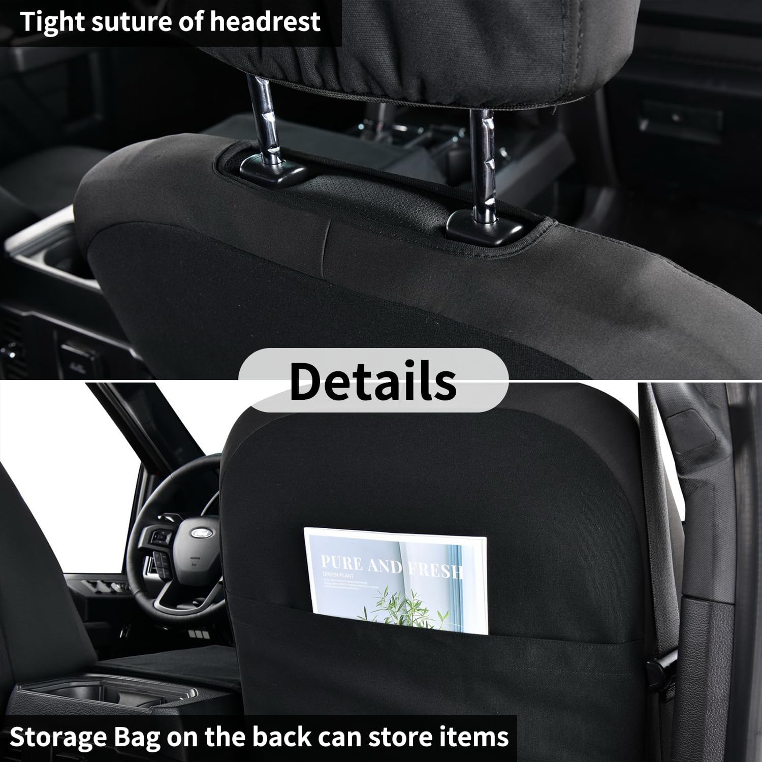 • Customized Truck Seat Covers: Each pack comes 2 front seat covers and a console cover๏ผˆheadrest cap included), compatible with airbag, seat belt cutouts, headrests and console, to offer perfect protection for your vehicle. Car Fitment-2015-2025 F150 SuperCrew 2017-2025 F250 F350 F450 Crew Cab