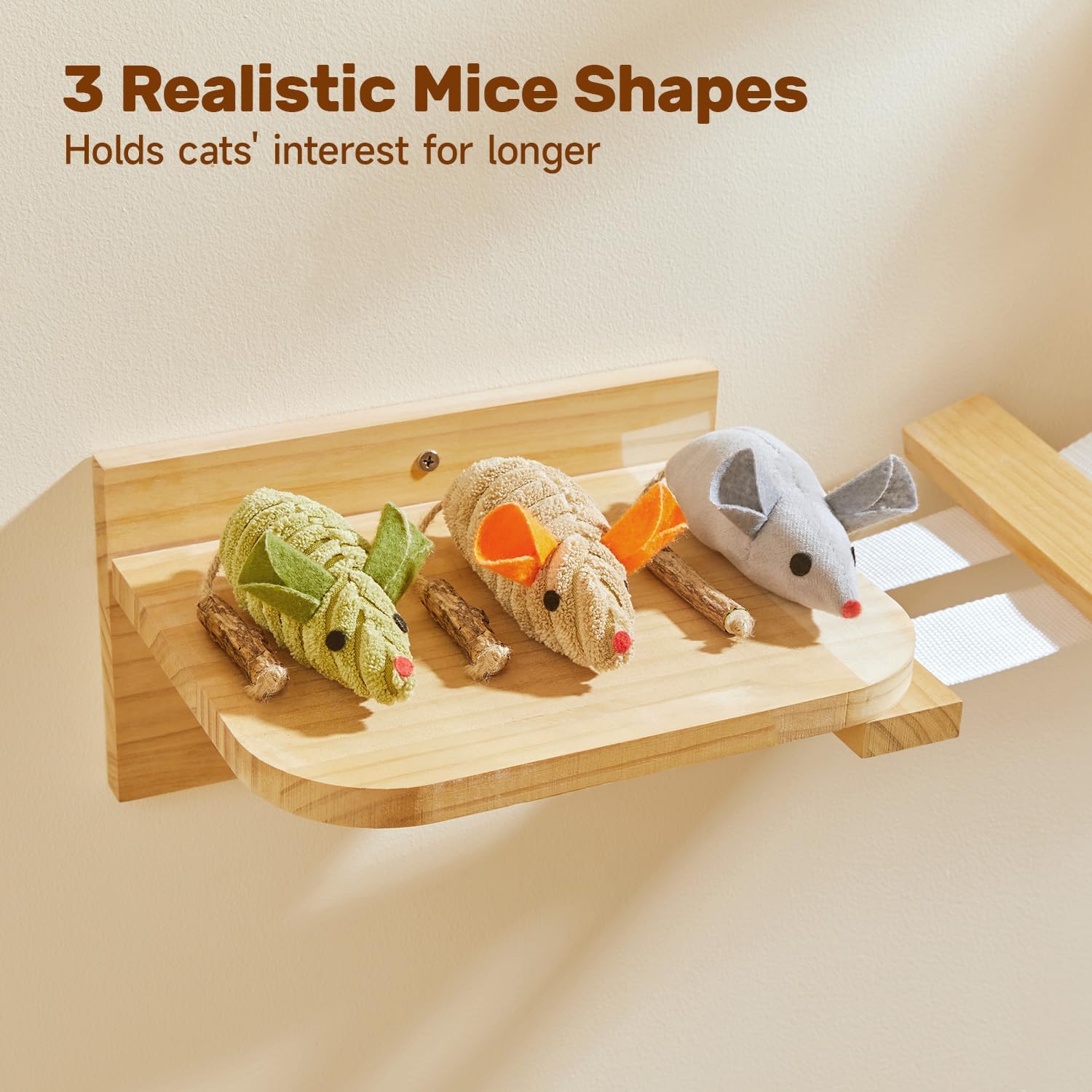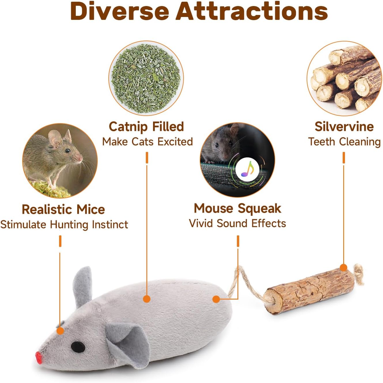 • Squeak Mice โ€“ Make play fantastic with the 3 plush squeaking mice toys. The cat toys make lifelike mouse chirping sounds once playtime begins, beckoning every bat, bite, chew, and chase! The mice kitten toys keep quiet when left alone to save battery power