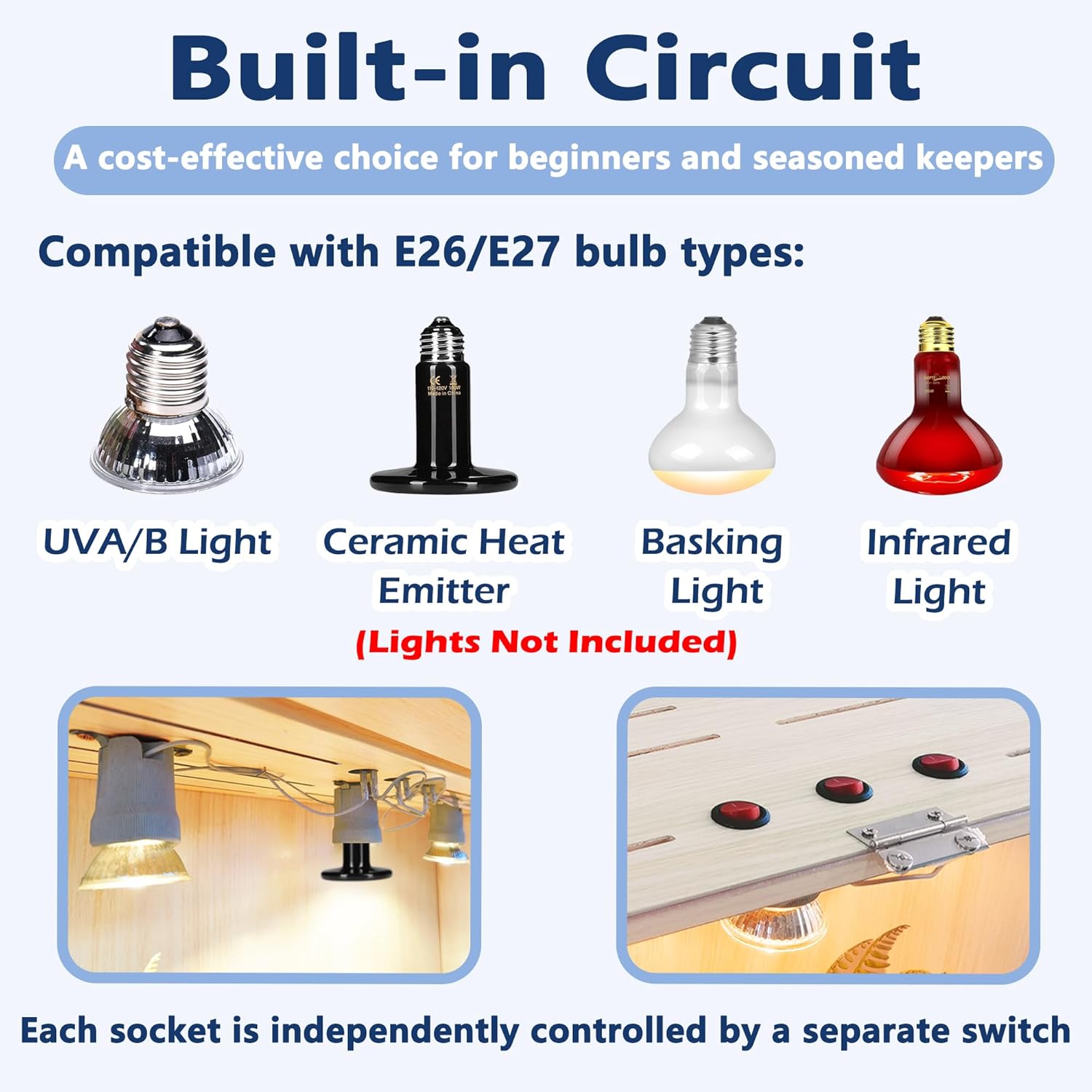 • 【Convenient Bulb Sockets】Equipped with built-in bulb sockets and switches (three in the 40/48-inch version), our terrarium accommodates various E27 bulbs for heating, lighting, and night illumination (bulbs not included). Installing the lights is a breeze, making it an ideal habitat for your reptiles.