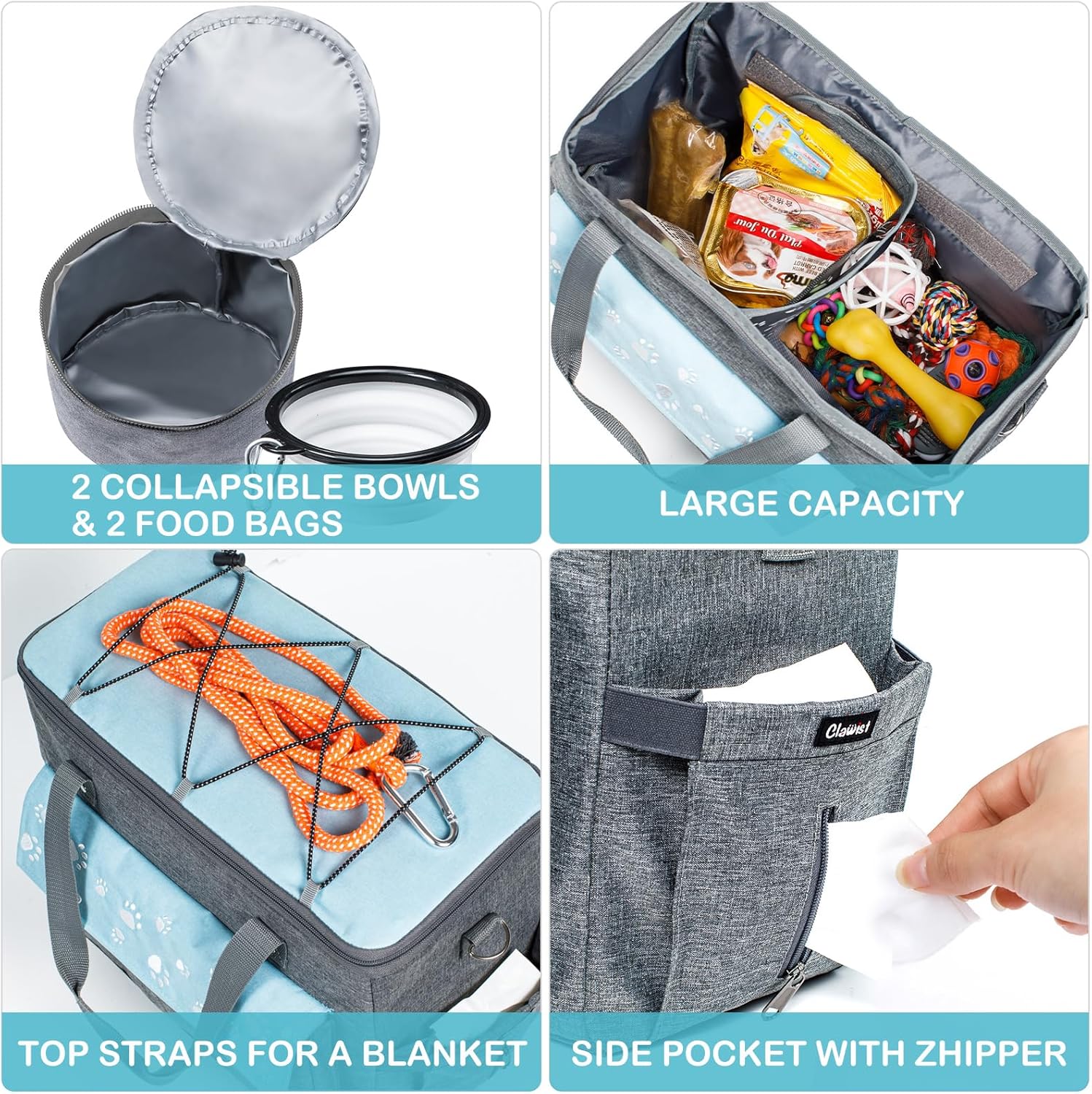 • WELL MADE - Clawist large dog travel bag is made with heavy-duty materials with padded lining. Carry it on your shoulder or by hand. The dog food bag is with PEVA lining which is easy to clean. The collapsible bowls are made of silicone and are dishwasher safe.