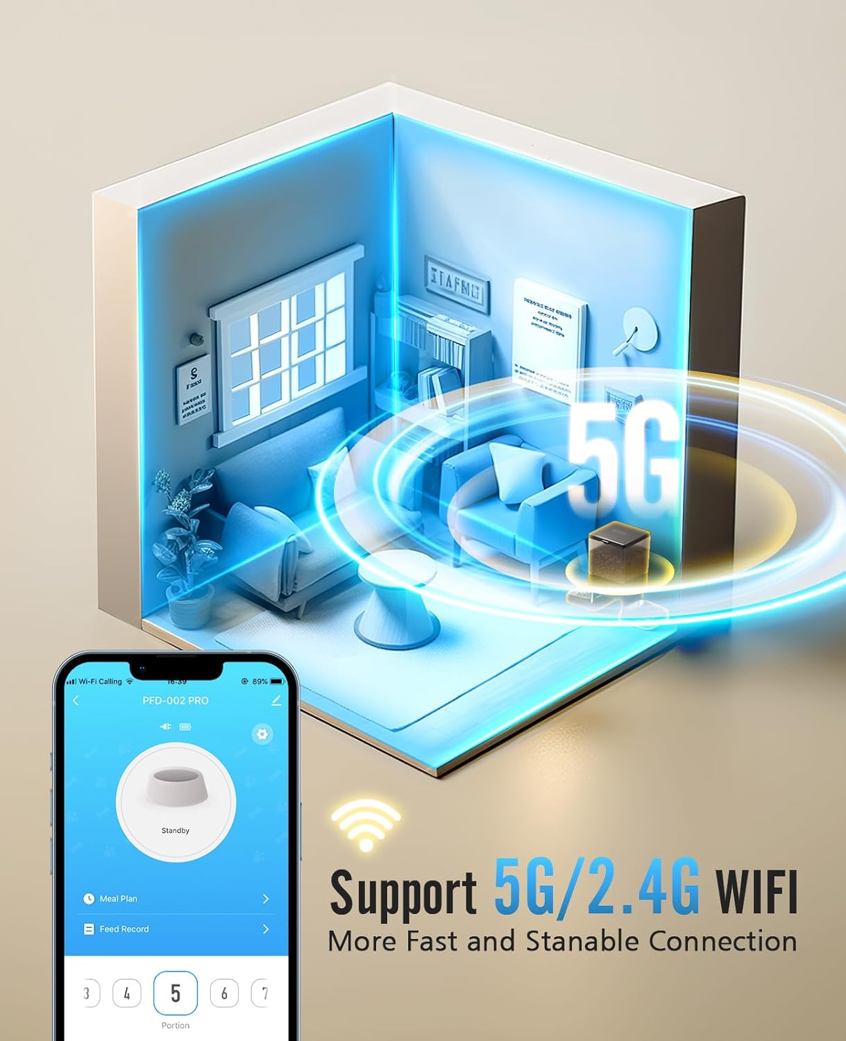 • 5G Stable Wi-Fi Connection: oneisall automatic cat food dispenser can connect to 5G/2.4G Wi-Fi. Compared to 2.4G Wi-Fi, this feeder with 5G feature would connect to network more stably. You donโ€™t need to worry about failing to control when you are out of home