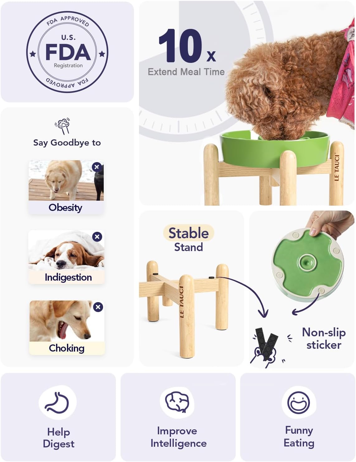 LE TAUCI Ceramic Slow Feed Dog Bowls, Elevated for Small Breeds, Anti-Gulping, Non-Slip, 6 inch, Green