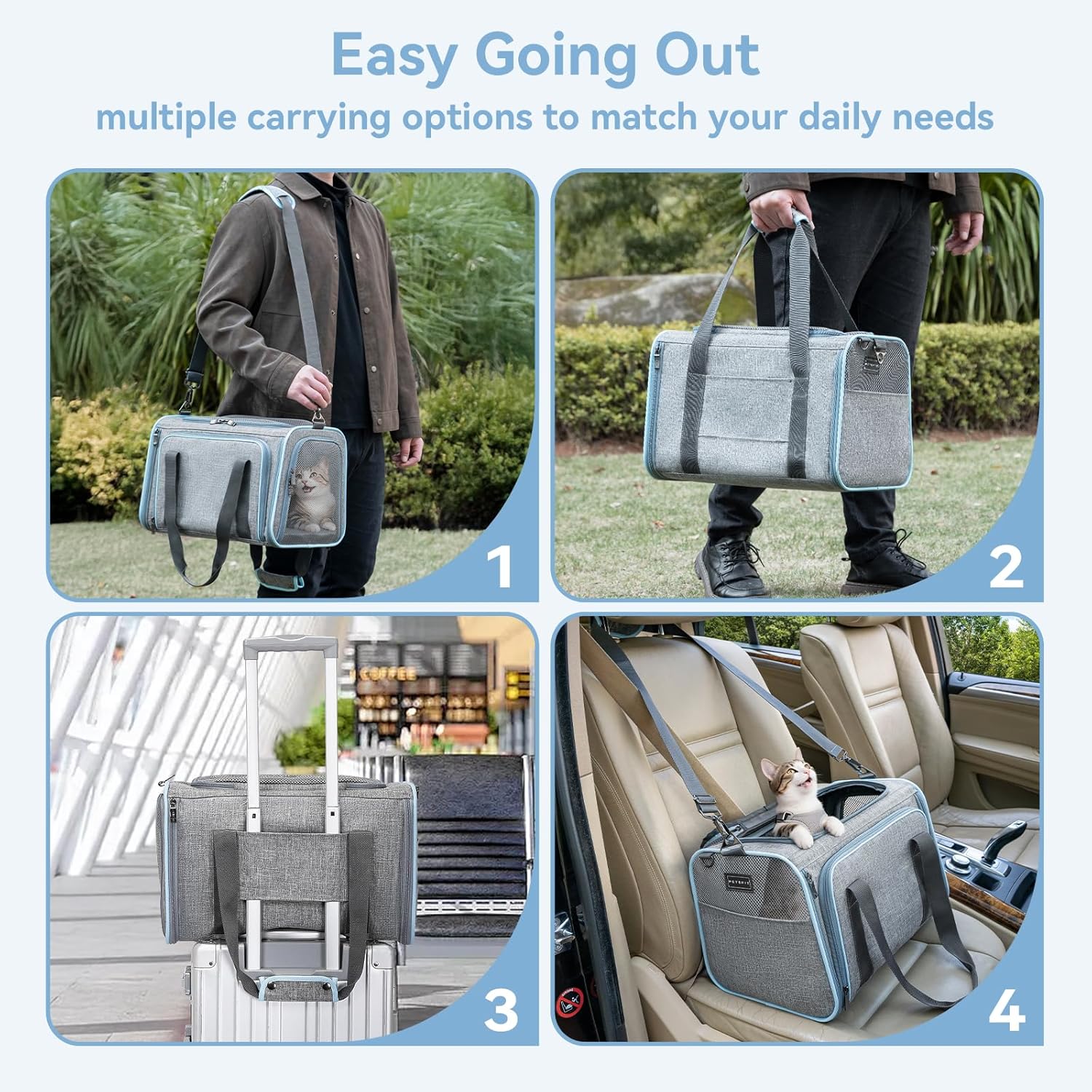 • 【Comfortable Space】 Expandable cat carrier enables pets to sprawl out, lay, see all around and relax when you have a flight trip, also works great in the car, roomy and they lay in it like a bed. The airline cat carrier can be folded totally flat when not in us.