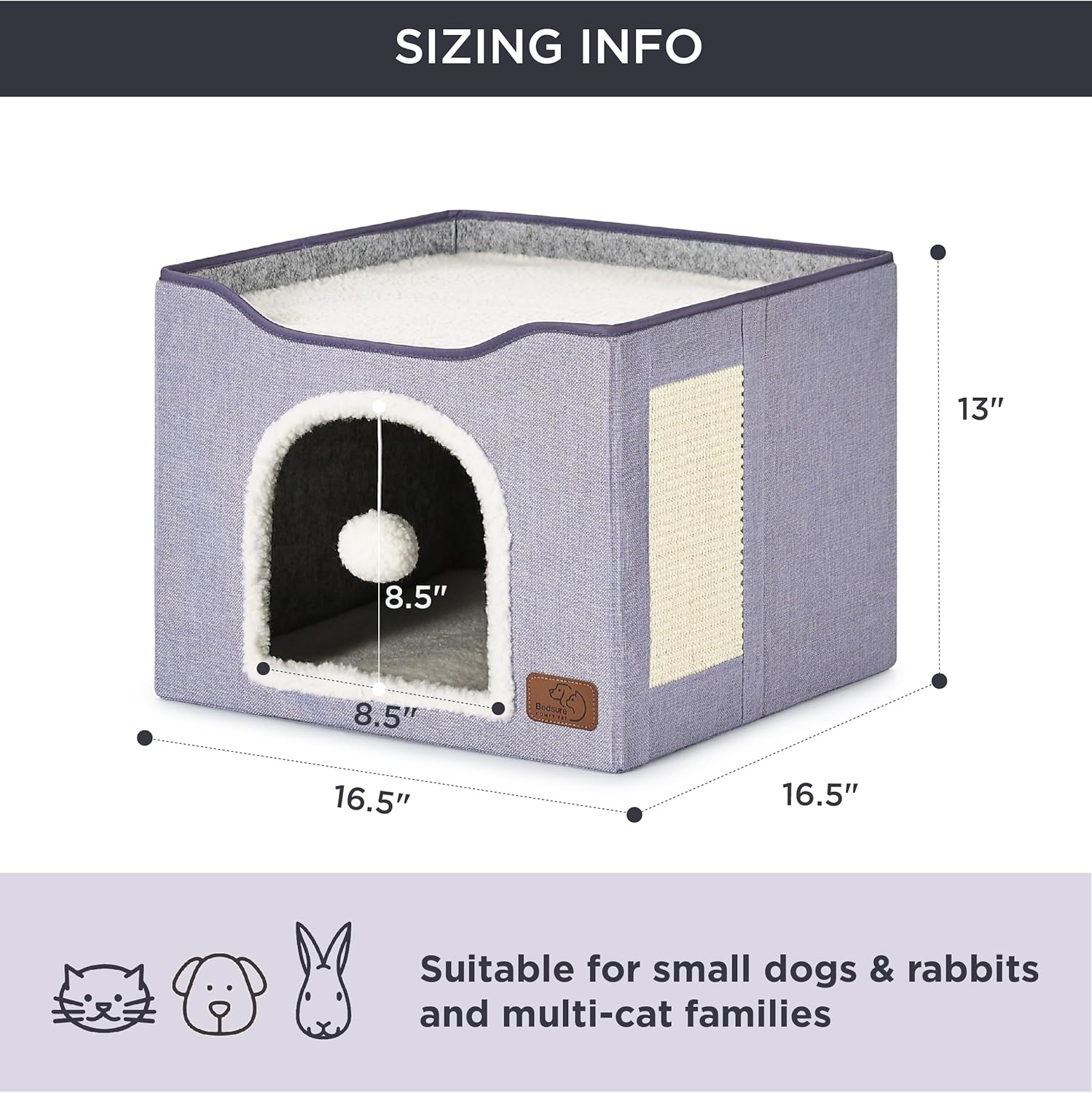 • Pet Safe Design: Cat hideaway made from pet-friendly MDF materials with CARB Certification and soft lambswool fabric. This large cat house is equipped with a durable sisal scratching board and plush hanging ball to keep your cat engaged and happy.
