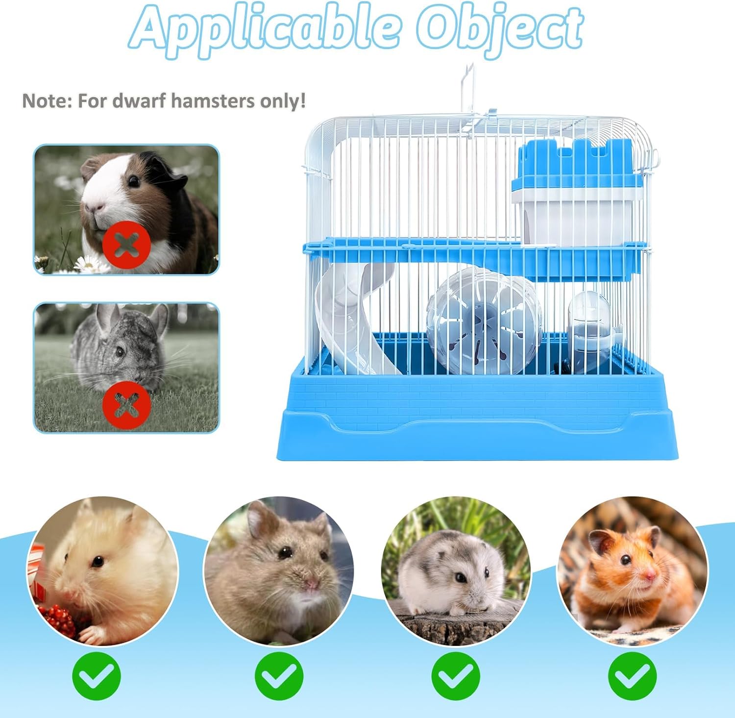 • Applicable Object:Portable hamster cage size is 11.7*8.7*9.8in, this cage is not suitable for chinchillas, guinea pigs and other larger pet rats, it is suitable for small hamsters, gerbils, roborovski rats and other dwarf rats