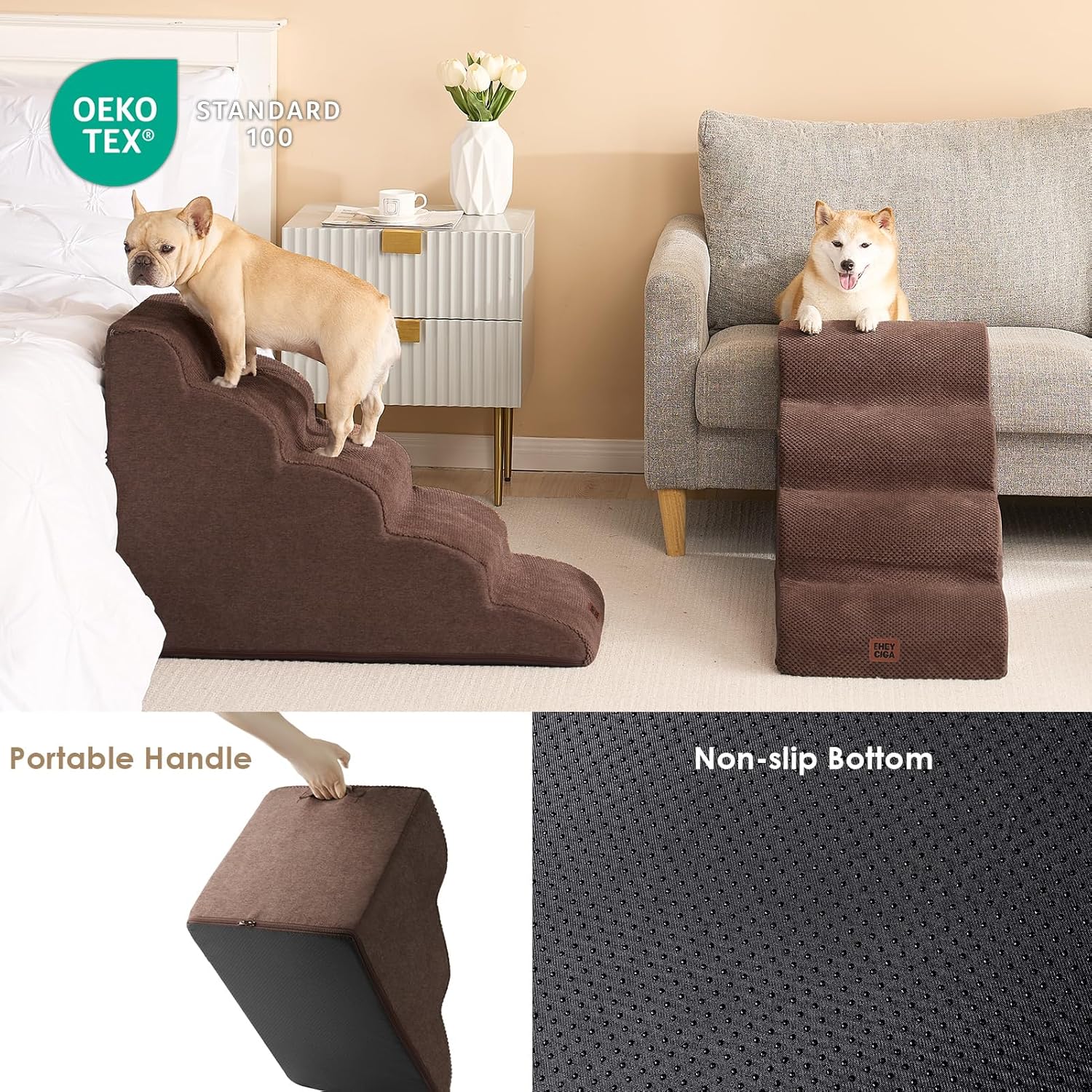• MULTIPLE STEP SIZES - This dog stair has 2 steps, 3 steps, 4 steps and 5 steps to choose. Our 2-step stairs fits for chair/sofa/bed up to 13inch. 3-step stairs fits for chair/sofa/bed up to 17inch. 4-step stairs fits for chair/sofa/bed up to 21inch. And 5-step stairs fits for chair/sofa/bed up to 24inch.
