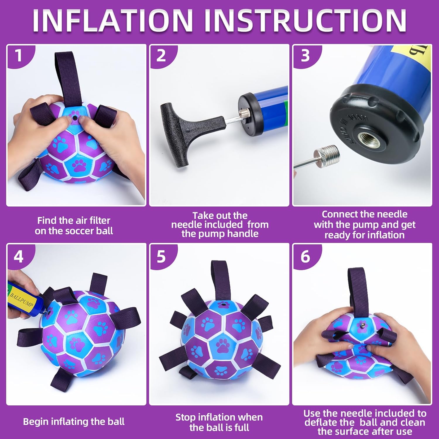 • Pump & Needle Adapter included: The herding balls for dogs comes delated. There's a needle point adapter and apump inside as well while other items in the same market only include a bal needle. The soccer ball dog toy is 8inches in dlameter, perect for large breeds, not for aggressive chewers.