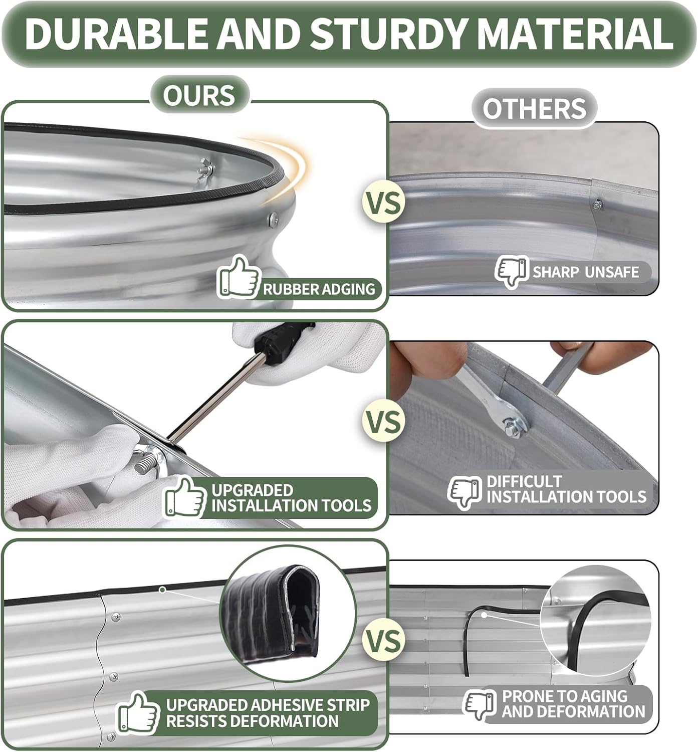 • 【Double Safety Edge Design】 The top edge of the garden bed is folded to prevent sharp edges, and we also provide rubber strips for added protection. The galvanized planting box is the perfect start for your favorite vegetable garden.1More raised bed is your best choice for worry-free gardening.