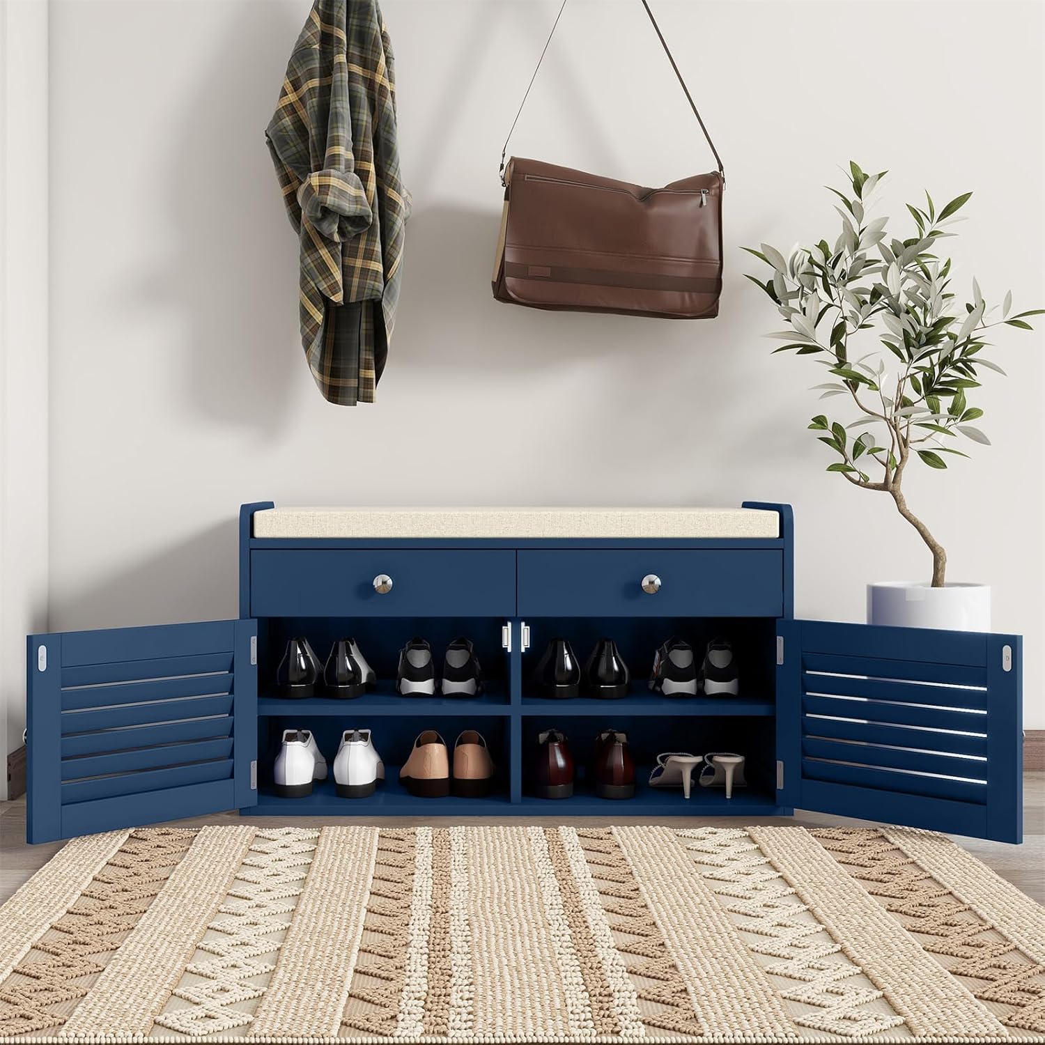 - Modern Storage Bench for Any Scene -- A neutral color matching plus louvered design door will add stylish look to your home. Breathable Cabinet Doors, cushion seating and storage in one feature is very suitable to as a shoe bench for entryway, a storage bench for closet room, or a storage chest in end-of-bed.
