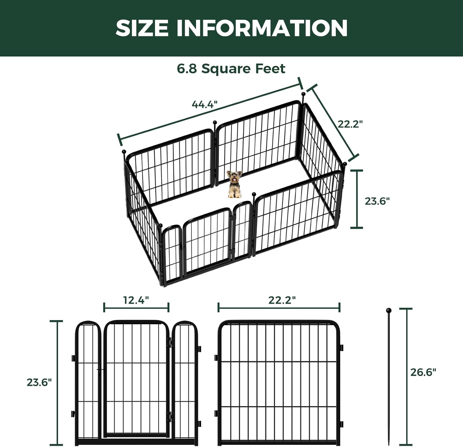 • Super easy to assemble: It won’t take you more than 5 minutes to assemble these portable dog fences as well as pack them away due to the rod-connected design. Meanwhile, panels can be added or removed freely to give you a fully flexible area and arrange the dog pen in any shape you need.