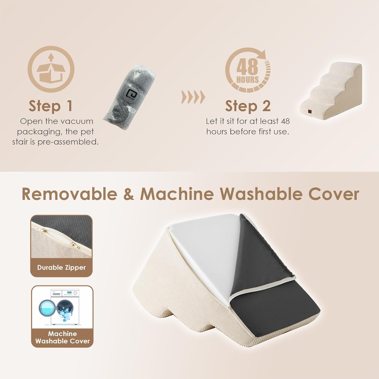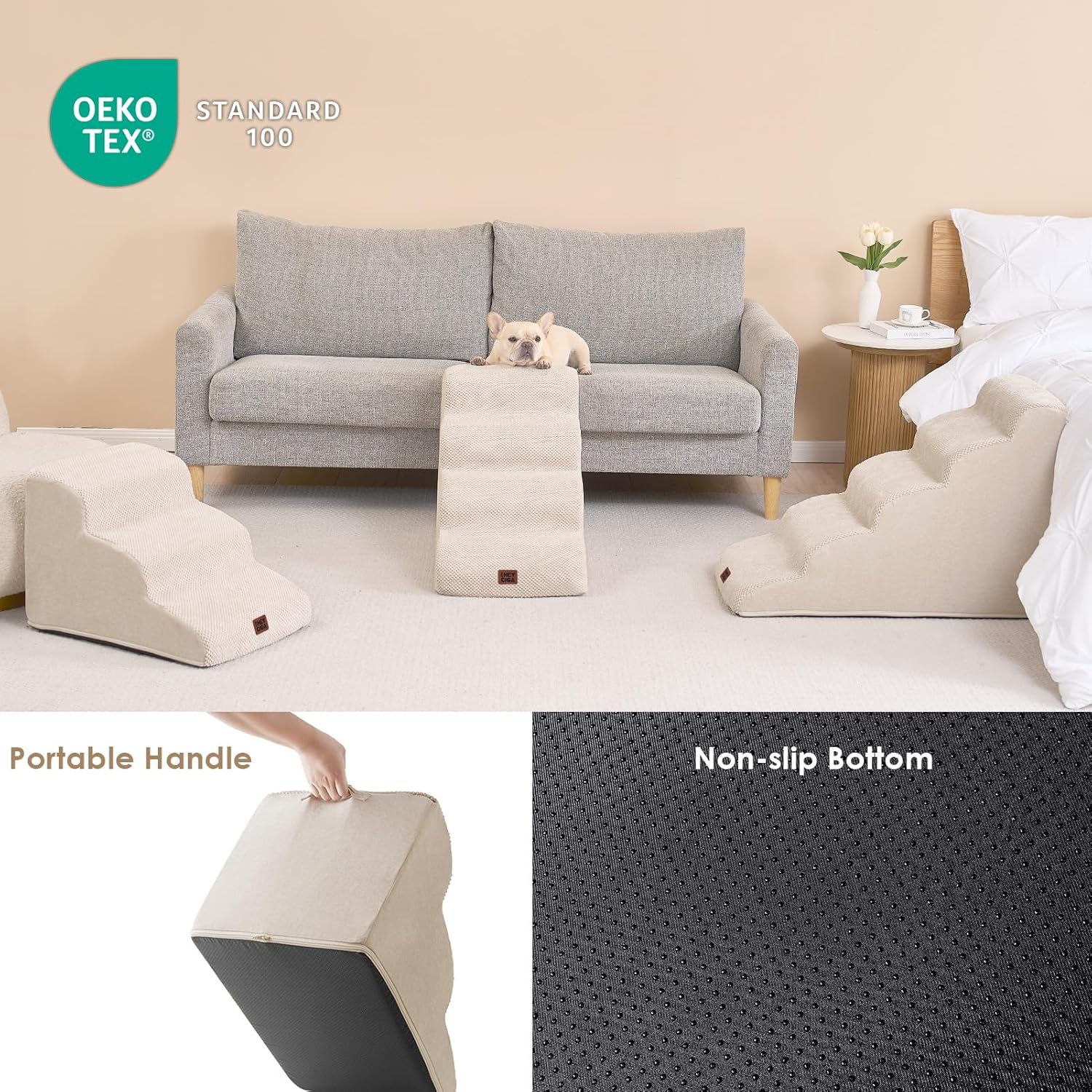 • COMFORTABLE PET STAIRS - This foam dog stair is designed directly against the edge of a bed, sofa or other furniture, so your pet can climb up and down comfortably.