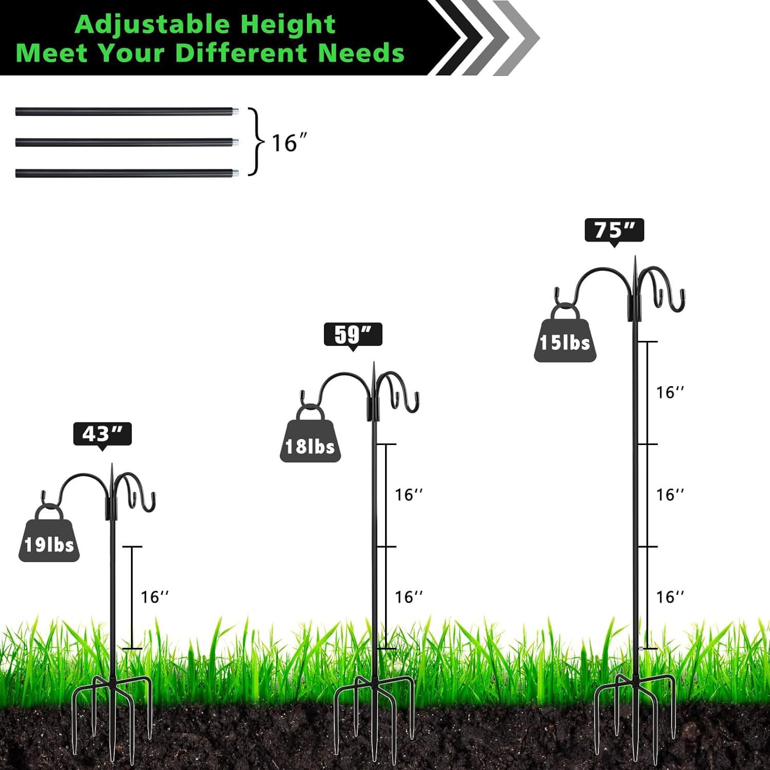 • 【FREELY ADJUISTABLE HEIGHT】Our bird feeder hangers are 76 inches high (including the base) and 16 inches wide. Each shepherds hook for bird feeder includes 3 extender pole with a length of 16 inches, you can free to adjust the suitable high. The height can be adjusted according to your requirements (44", 60", 76" ). The max load-bearing capacity of 76 inches is 15 lb.