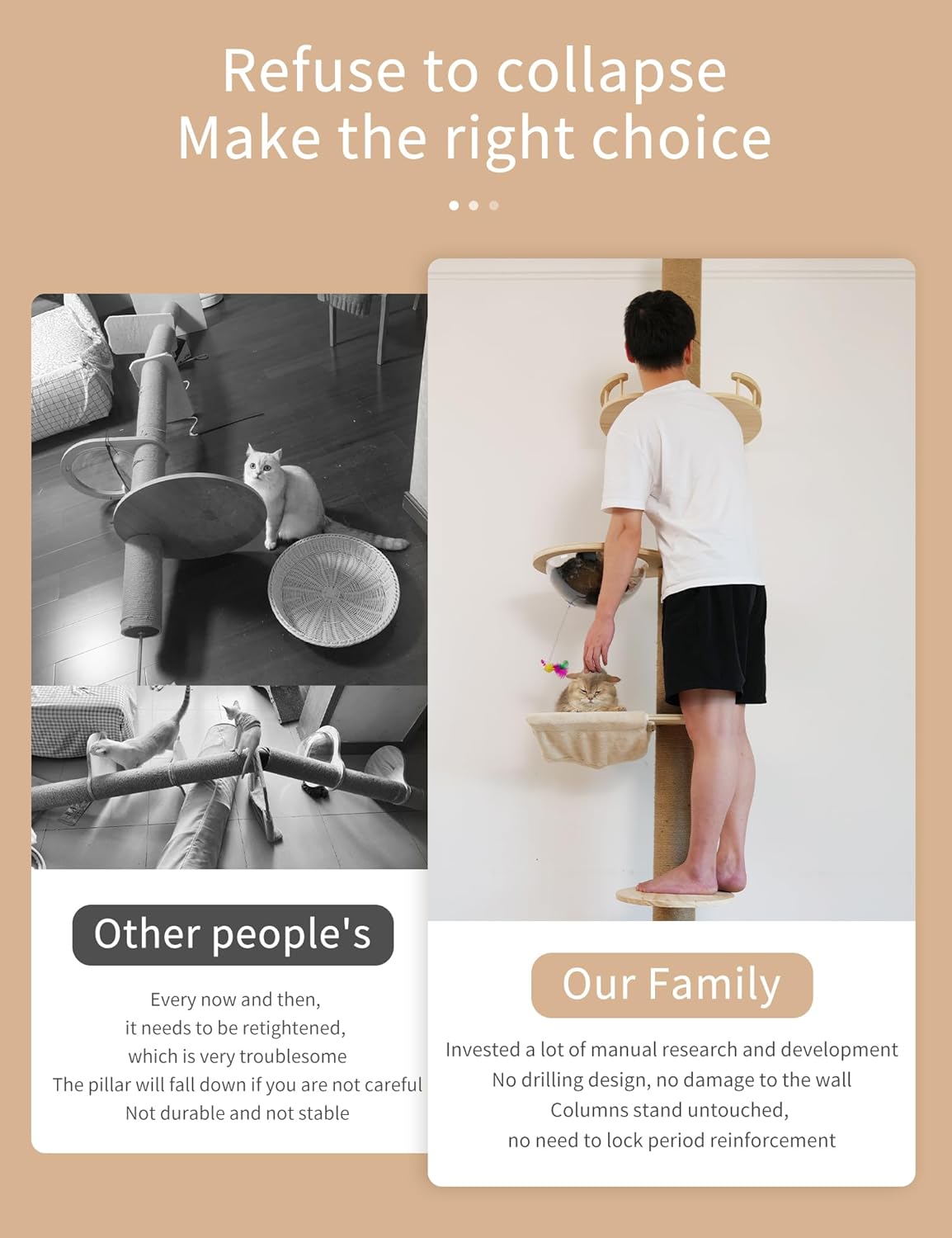 • The Floor to Ceiling Cat Tower eliminates the need to drill holes in the ceiling walls, and the new design of the top 3 support rods can hold up to 140 pounds for a more stable tower. No need to worry about an unsteady fall, resulting in cat injuries and furniture damage!