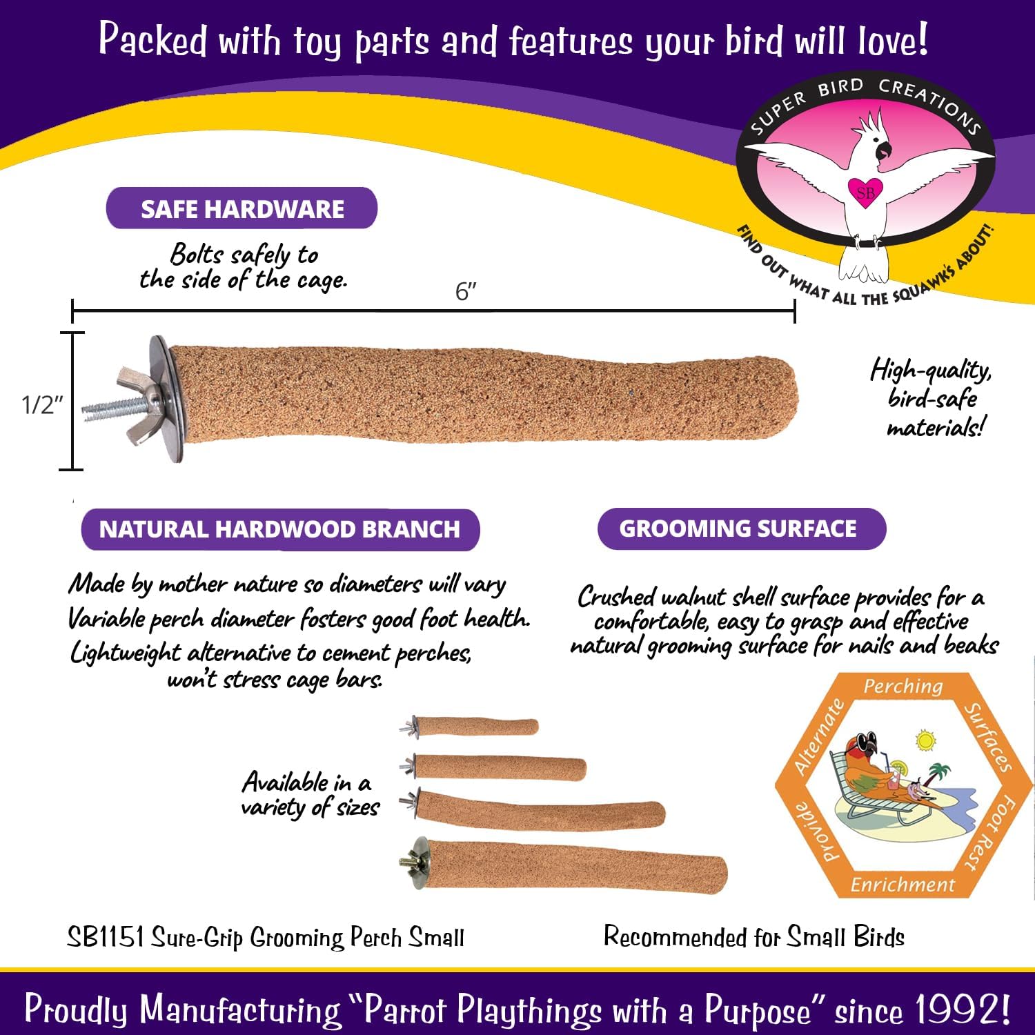 Super Bird Creations SB1151 Sure-Grip Grooming Perch Small, Small Bird Size - Enriches Beak and Foot Health - Ideal for Parrotlets Parakeets Finch Canary - Small Bird Size, 1/2" diam x 6" (Small)