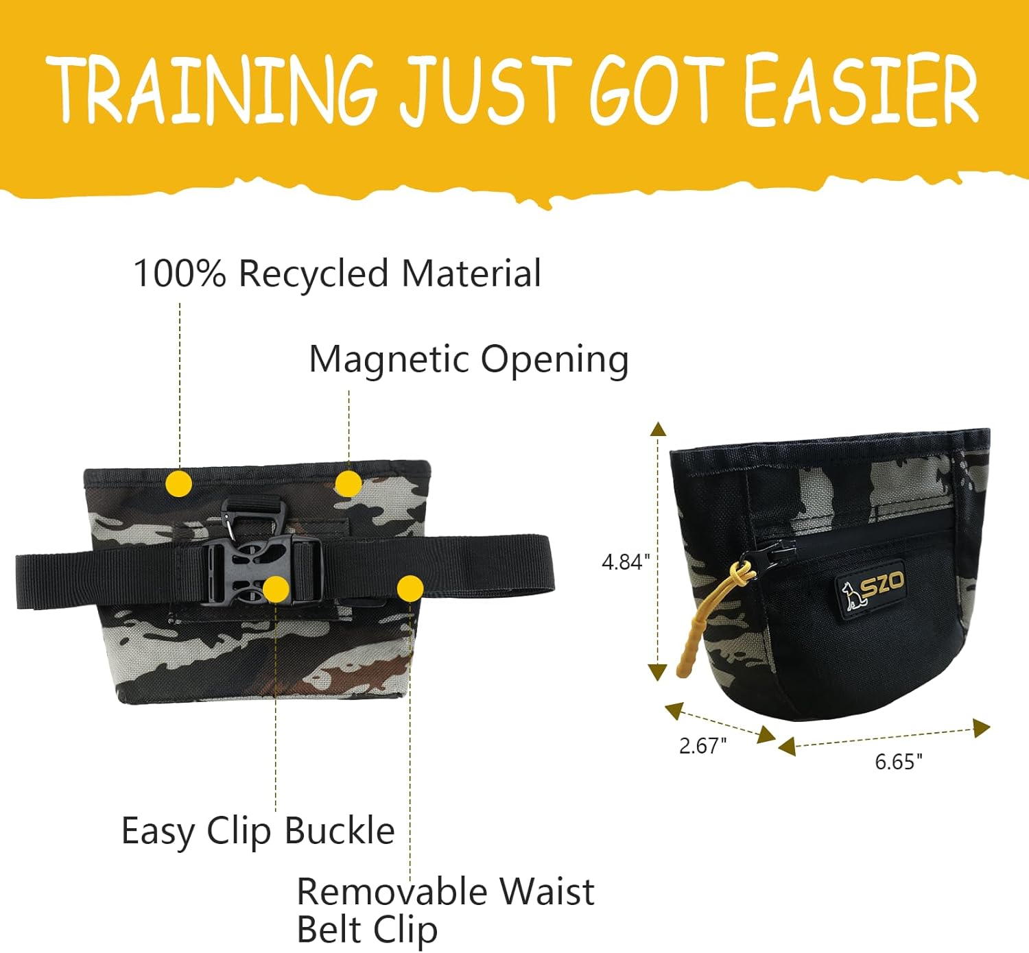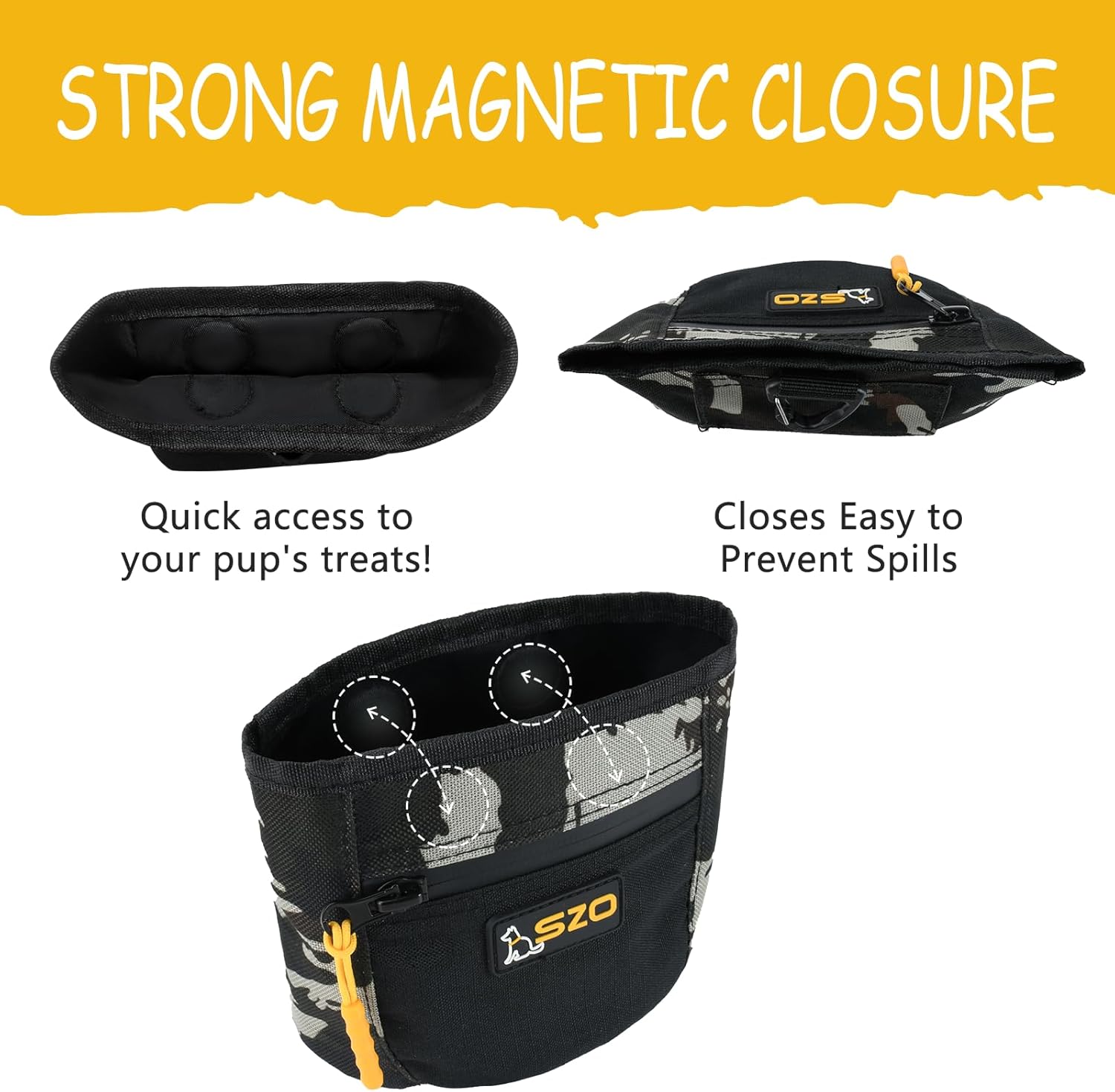 • Easy To Use — SZO dog treat pouch is designed to fit your everyday use when training your pets. It features a magnetic closure, allowing quick and one-handed access to your pet's favorite treats. And a front zipper pocket to secure personal items!