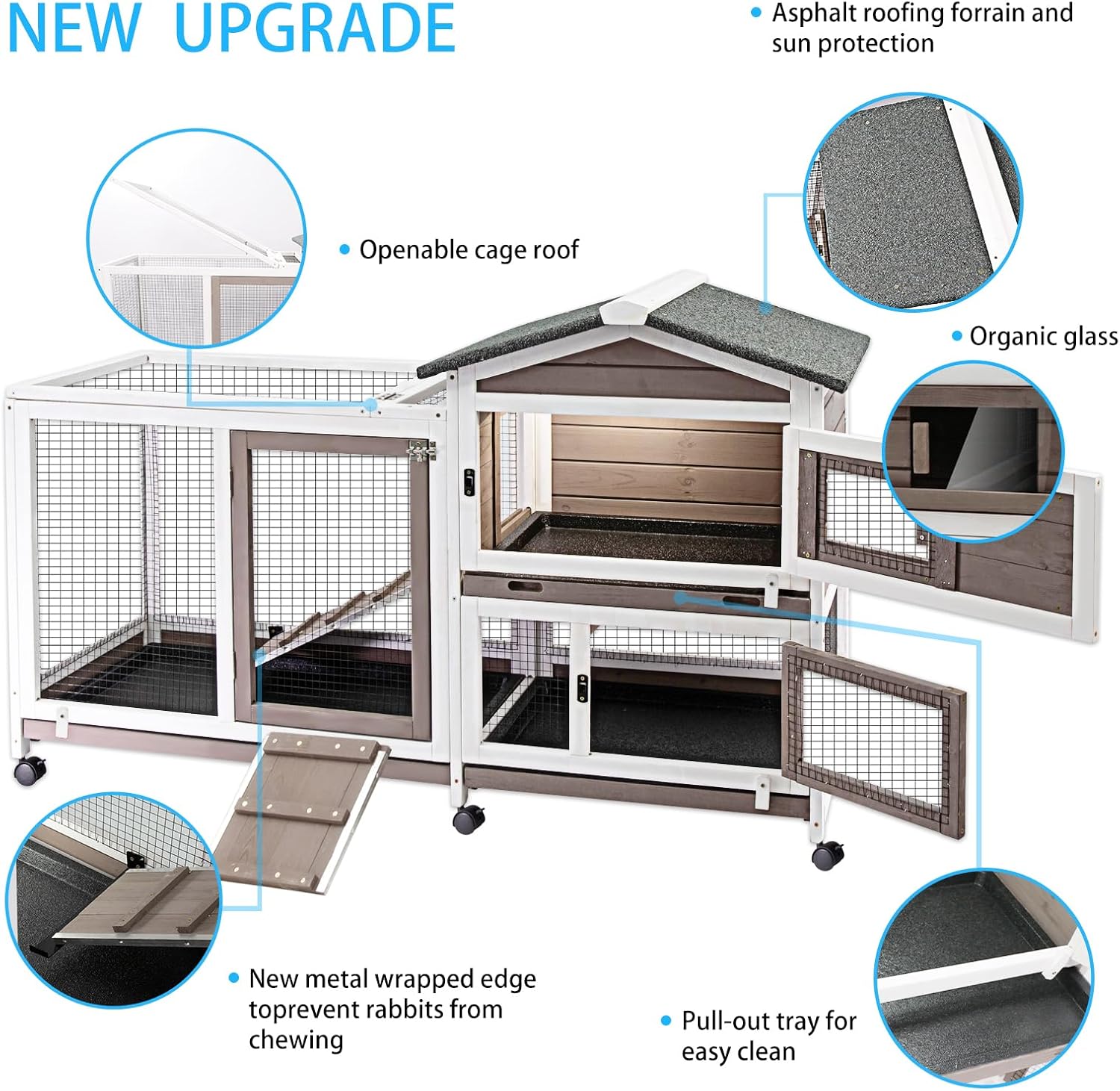 • 【Humanity Design】The 3 removable trays of the rabbit cage indoor make the guinea pig condo easier to clean which will not leak. The bunny hutch have 6 wheels which are convinient to move. You can easily to retrieve your pets from the cage as the top of the activity area is openable,which is also sinple for you to feed them.