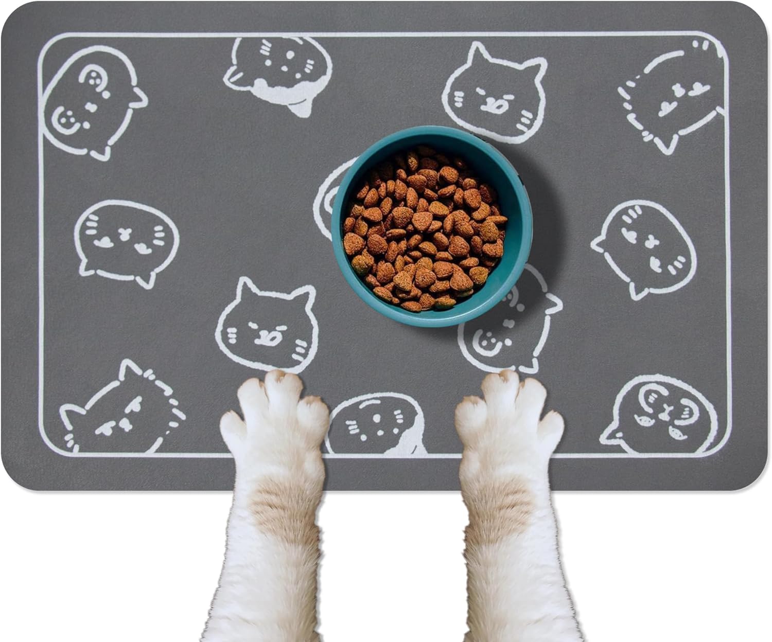 YCT Cat Food and Water Mat for Pets - Non-Slip Super Absorbent Dog Bowl Mat With Multiple Cat Heads Logo - 24 x 16.9 Inches, Dark Grey