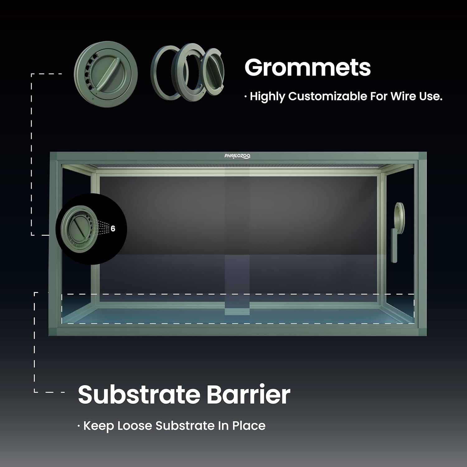 • ใ€Easy Maintenanceใ€‘Front opening reptile terrarium with door handles included for easy cleaning & feeding. No more suction cup problems or unsightly fingerprints all over. The substrate barrier keeps the substrate in place. Our tempered glass doors are durable enough to withstand scratching.