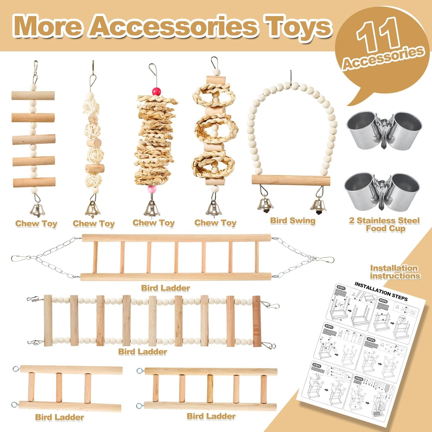 • Challenging and Stimulating Bird Toys: Keep your feathered friend entertained and mentally stimulated with a variety of toys including ladders, chewing toys, and a bird swing. They can explore different heights, fly or hop between areas, and climb up and down. This helps keep their beak busy and promotes physical and mental activity