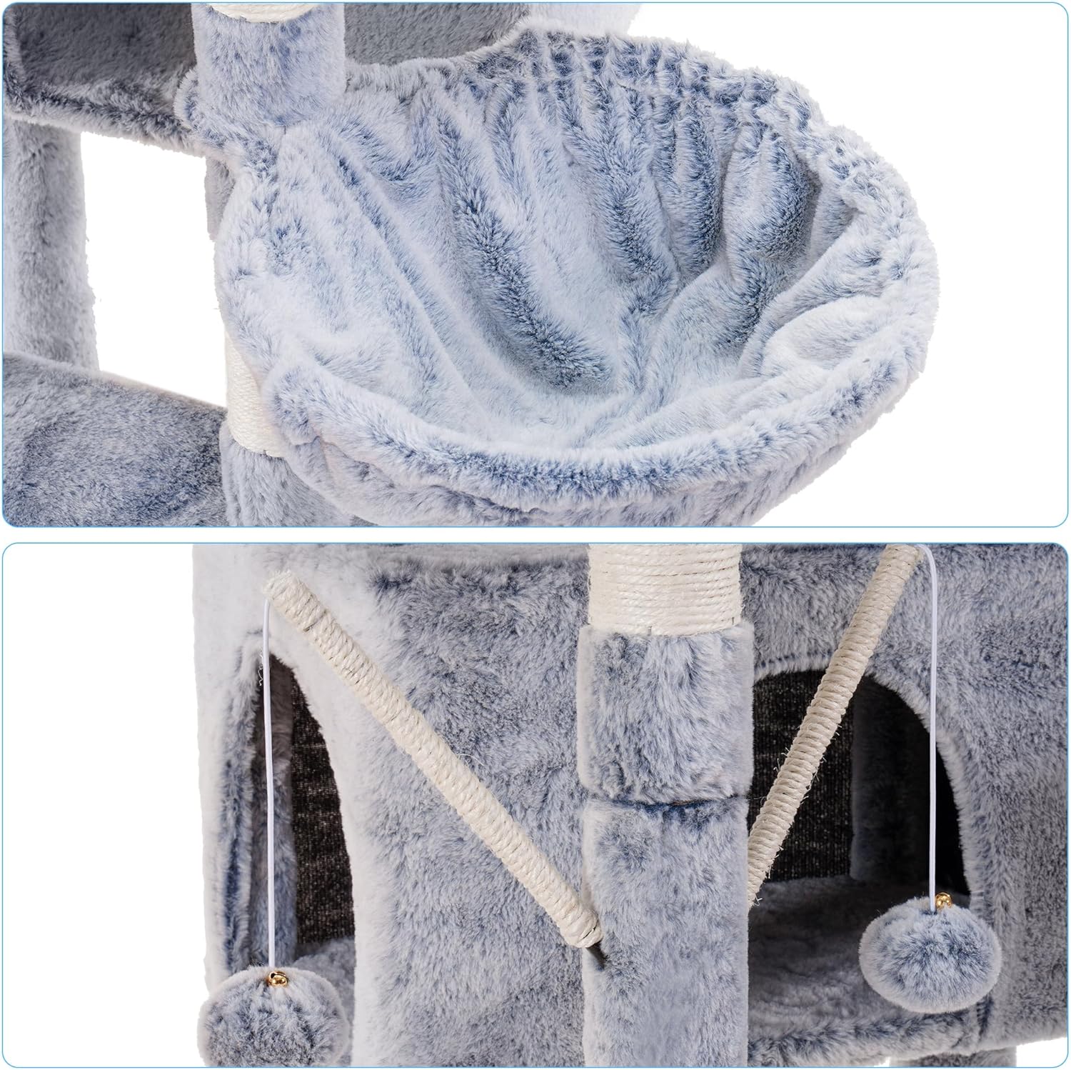 • Two hammocks in different shapes: A cozy basket-shaped hammock is cat's favorite, giving kitties a feeling of been wrapped up, like sleeping in a soft cloud. The hammock in the middle of the cat house adds more interest to curious cats