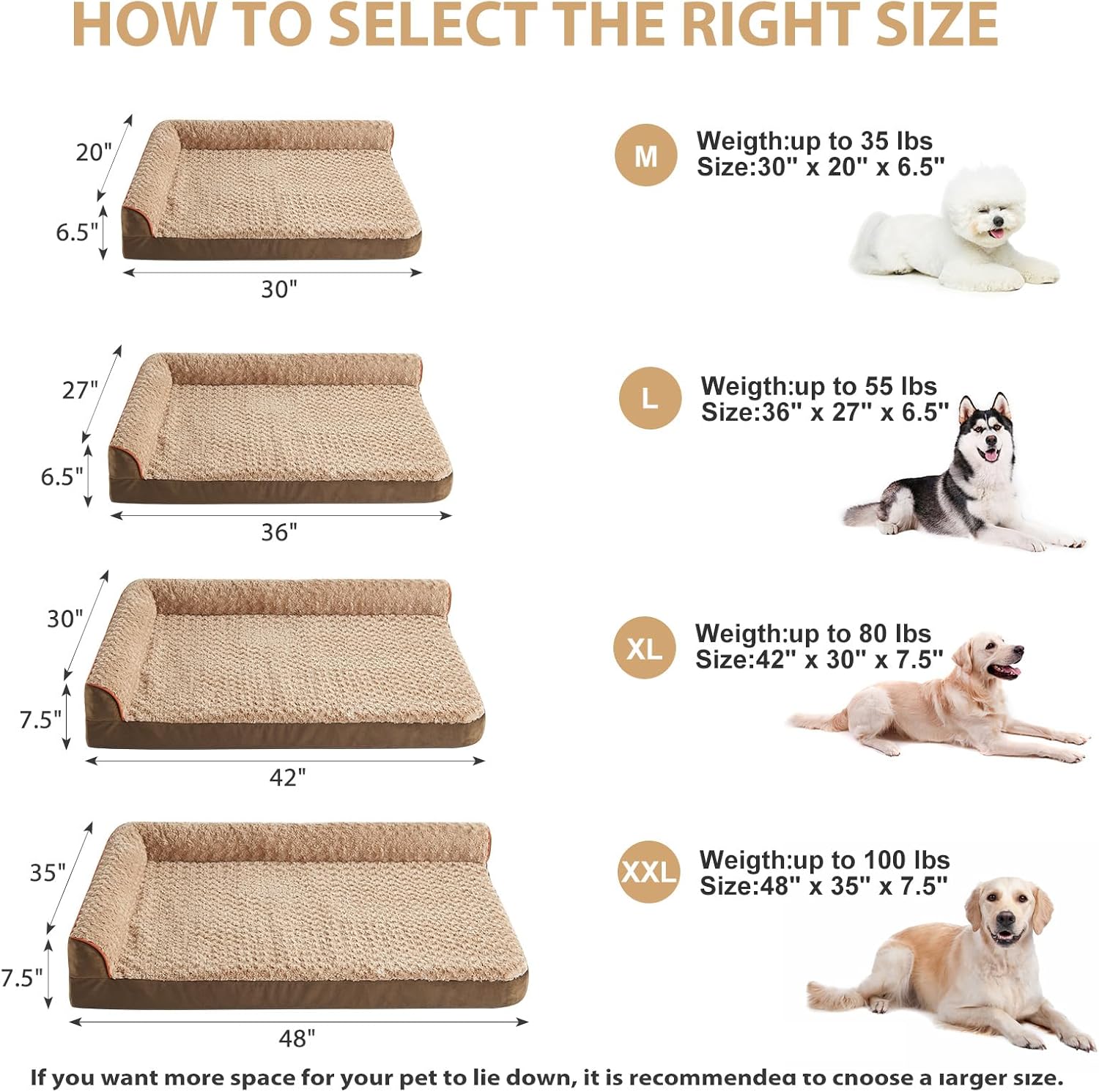 • SIZE(DOG BEDS FOR MEDIUM DOGS): The dimensions of this pet bed are 30β€œ x 20" x 6.5". Medium dog beds for Small and medium dogs up to 35 lbs. If you want more space for your pet, it is recommended to choose a larger size dog bed.