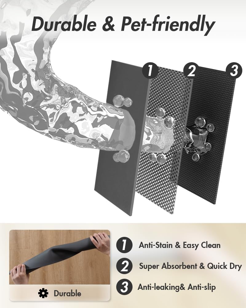 • Super Absorbent & No Stains: Special absorbent surface hide any messy stains completely.​ Magic pet food mat catch every drip off pets' chin around the pet water or food bowl. Prevent Say goodbye to spread stains and messy feeding area.