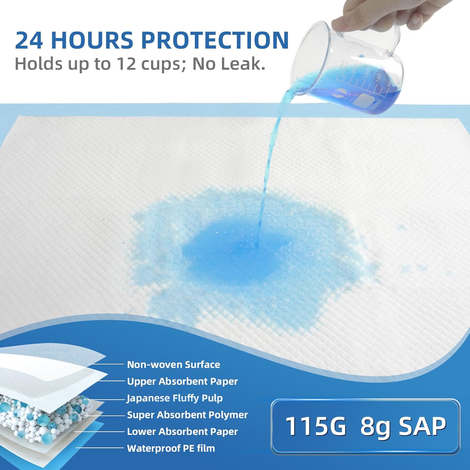 • XXL Large Size for Whole Night Use:SOFYFINE disposable bed pads size in 36"x36"(90x90 cm), can provide maximum coverage for bed from messy leaks and stains. Single pad weights 120g,can easily absorb over 2,400ml of liquid