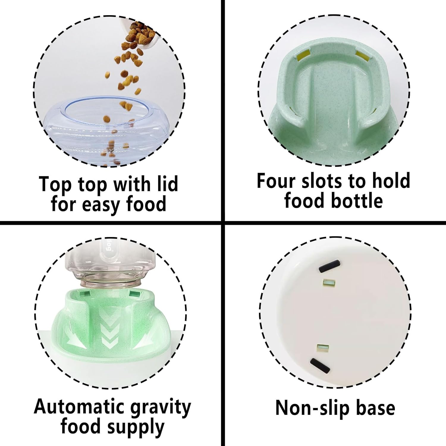 • 【Non-Slip Design】The top of the product is designed to remove the cap, convenient to add food, the base is solid, the center of gravity is low, it is not easy to overturn, the bottom of the four corners have anti-slip design, safety and stability do not need to worry about.