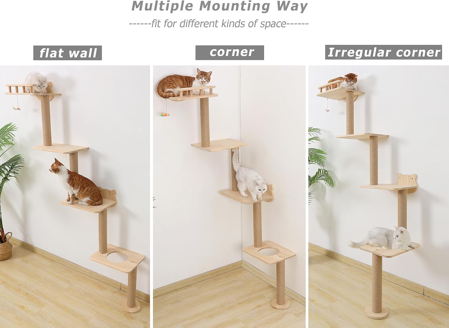 • 2.Great Space Saving Idea: The wall cat tree can be mounted in differnt ways, fit for flat walls or any irregular corners.The corner cat tree is an excellent solution for smaller homes, allowing your cat to enjoy their own vertical territory without taking up valuable floor space.