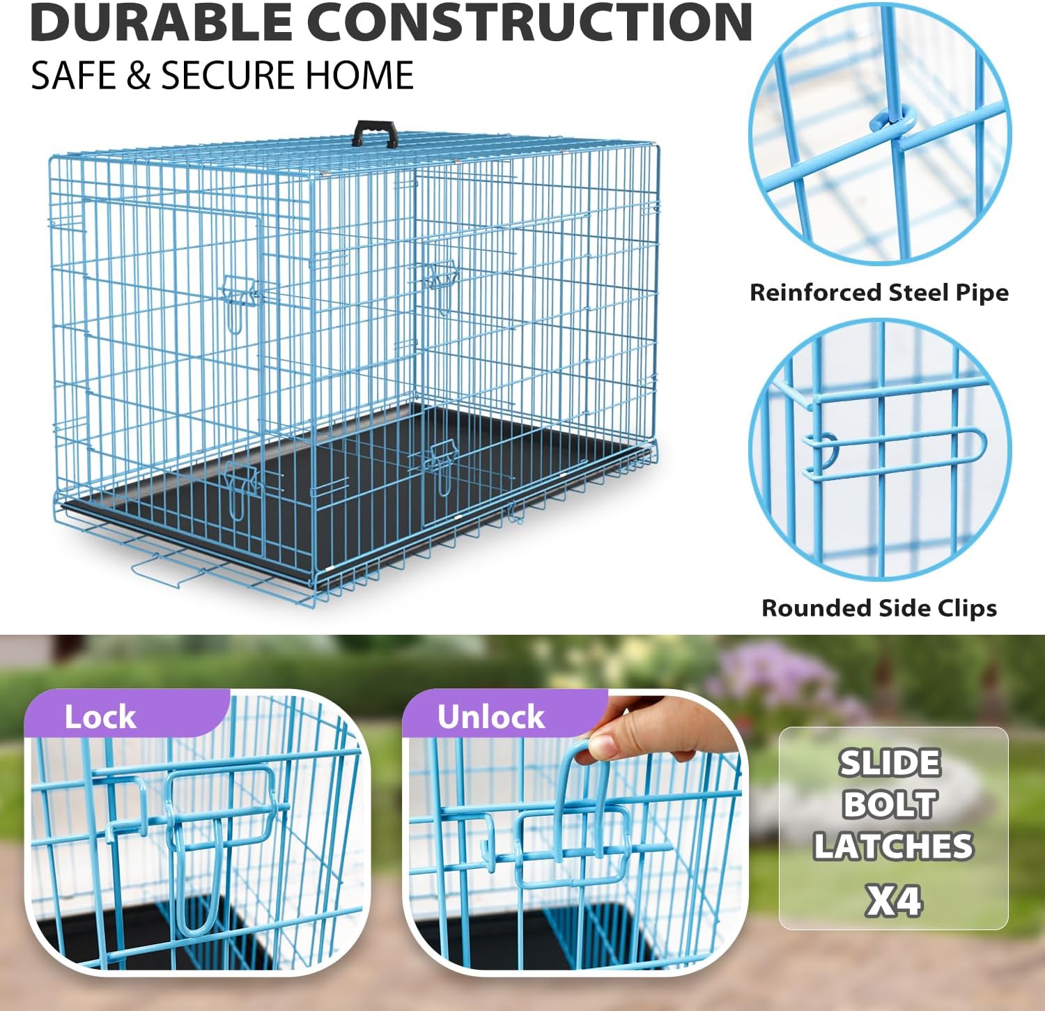 • SAFE & SECURE DOG CAGE: This durable dog cage features reinforced steel pipes, rounded corners, and dual latches on both front & side doors, to keep your pet secure during dog training or quiet time.