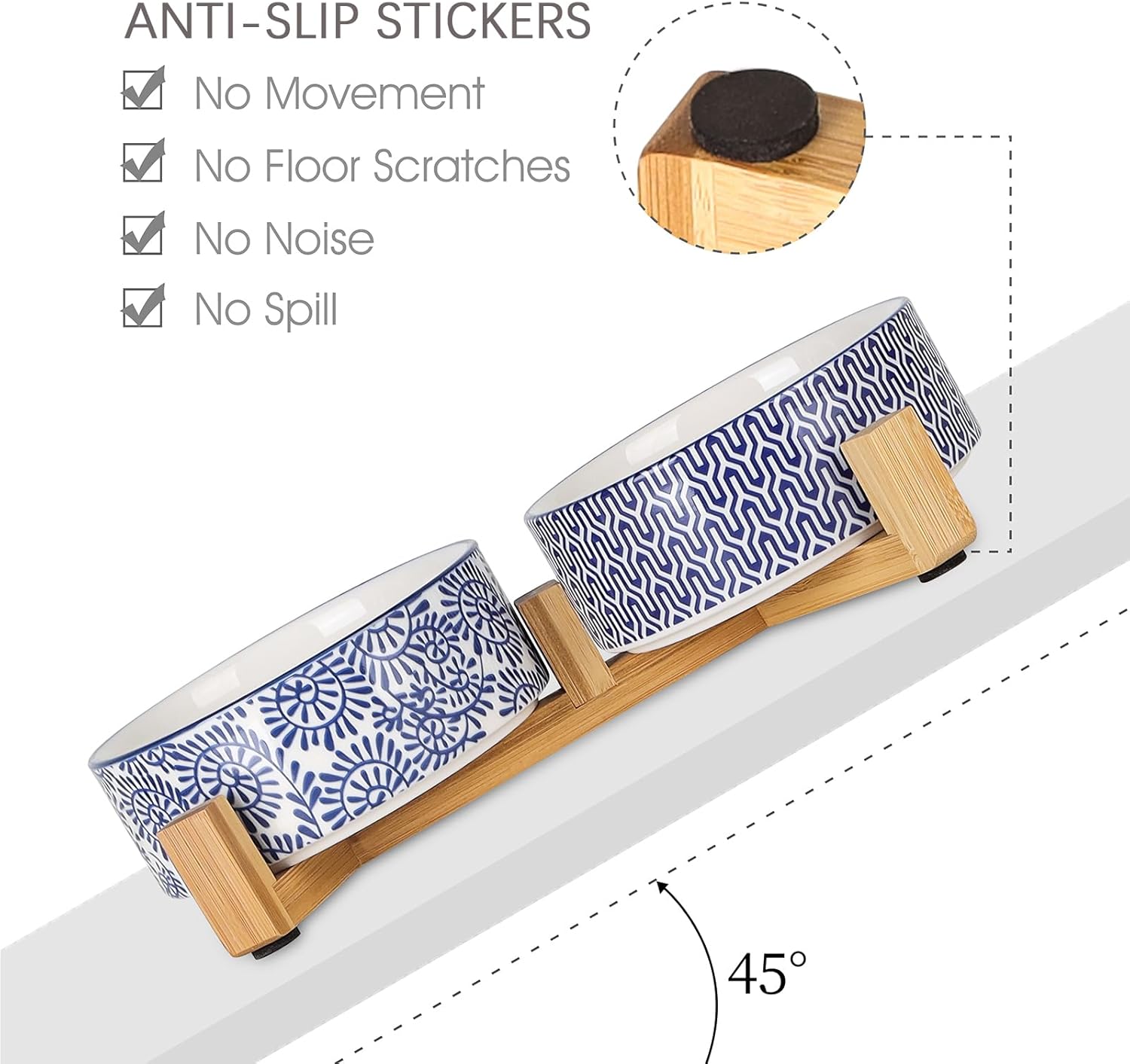 • DOUBLE BOWLS, DELICATE DESIGN - The thoughtful design of these double bowls offers convenience for your pets. You can use one bowl for food and another one for water, raising the dishes closer to your pet for more comfortable eating. Decorated with blue flowers and geometric patterns, these make them more unique that fit perfectly with any home decor style.